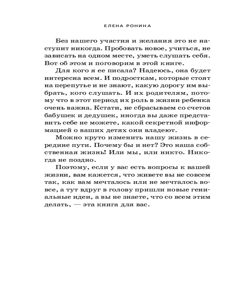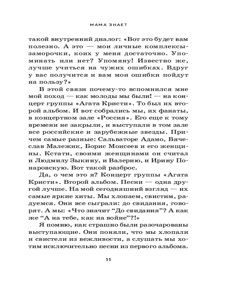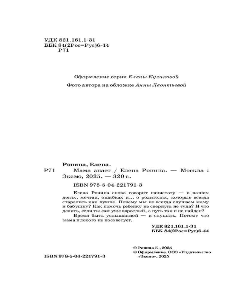 Мама знаетВ данный момент этот товар отсутствует в продаже. Возможно, у нас найдется аналогичный или похожий товар здесь. Серия: Близкие люди. Романы Елены Рониной Всю жизнь мы пытаемся кого-то обогнать. Стать быстрее той самой соседки, сильнее одноклассницы, выше самой себя — и чтобы при этом даже не вспотеть. Бежим и бежим, сначала с мамой, потом с дочкой и внучкой... И нет конца этому безумному кроссу, пока вдруг не настигает осознание. Мое время уходит, но была ли я счастлива? Ценят ли меня близкие? Слышат ли они меня? В своей новой книге Елена Ронина, откровенно и с юмором, делится личными историями, наблюдениями и жизненными уроками. Она говорит так, как может только мама — которая не сравнивает, а просто любит. |