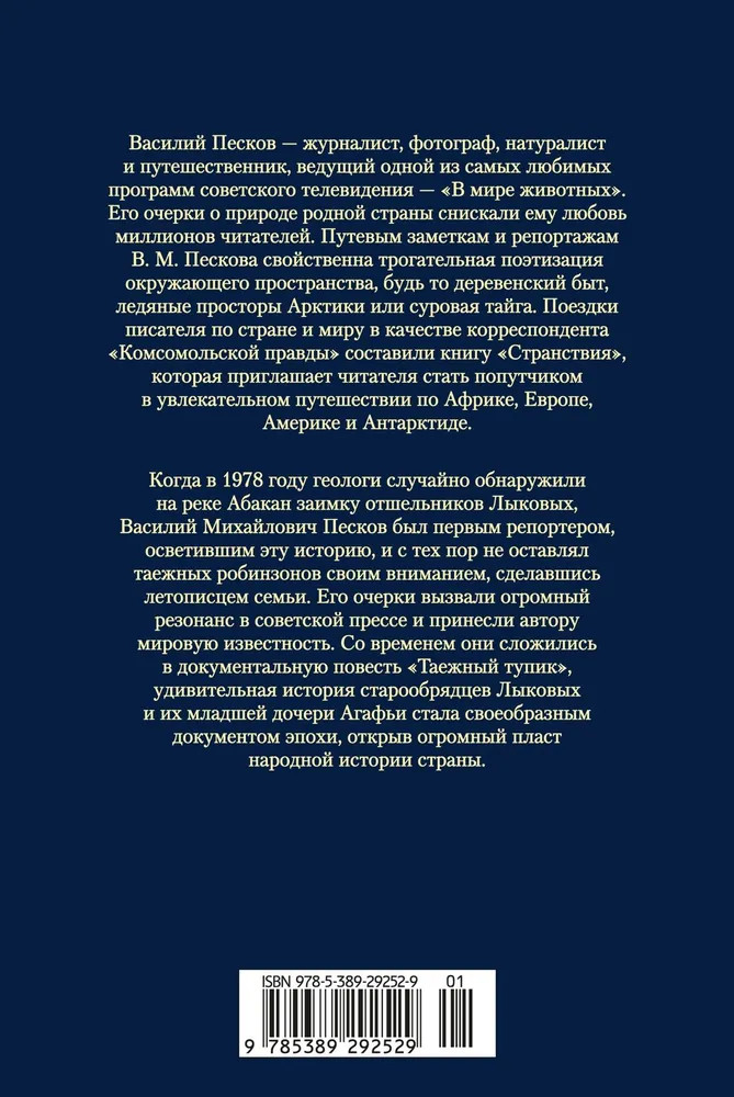 💳 Оплатить за товар можно при получении 🇰🇿 Есть бесплатная доставка по Казахстану от 1 дня 🎁 Копите бонусы с каждой покупки Серия: Non-Fiction. Большие книги Когда в 1978 году геологи случайно обнаружили на реке Абакан заимку отшельников Лыковых, Василий Михайлович Песков был первым репортером, осветившим эту историю, и с тех пор не оставлял таежных робинзонов своим вниманием, сделавшись летописцем семьи. Его очерки вызвали огромный резонанс в советской прессе и принесли автору мировую известность. Со временем они сложились в документальную повесть «Таежный тупик», удивительная история старообрядцев Лыковых и их младшей дочери Агафьи стала своеобразным документом эпохи, открыв огромный пласт народной истории страны. |