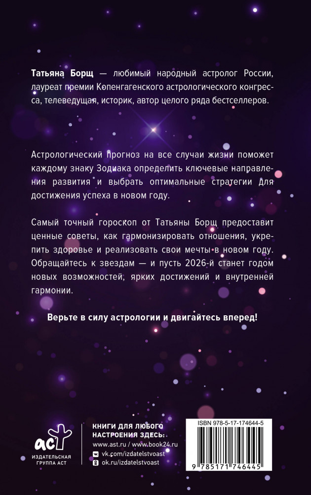 💳 Оплатить за товар можно при получении 🇰🇿 Есть бесплатная доставка по Казахстану от 1 дня 🎁 Копите бонусы с каждой покупки Серия: Борщ. Календари 2026 Татьяна Борщ — любимый народный астролог России, лауреат премии Копенгагенского астрологического конгресса, телеведущая, историк, автор целого ряда бестселлеров. Астрологический прогноз на все случаи жизни поможет каждому знаку Зодиака определить ключевые направления развития и выбрать оптимальные стратегии для достижения успеха в новом году. |