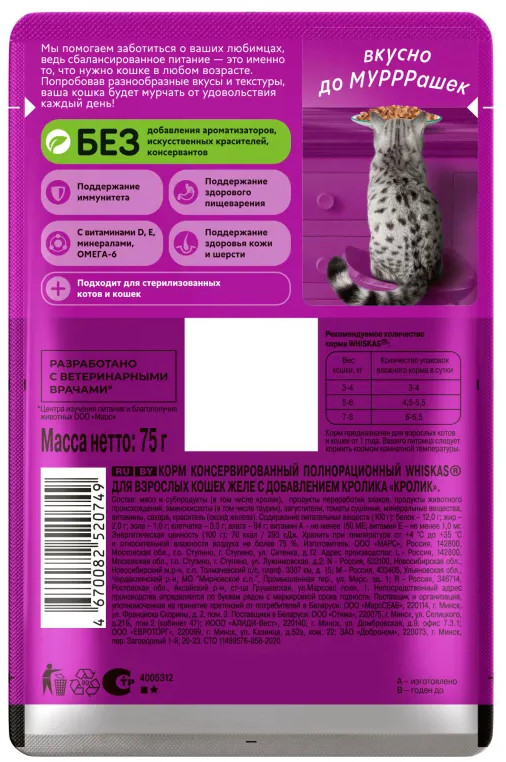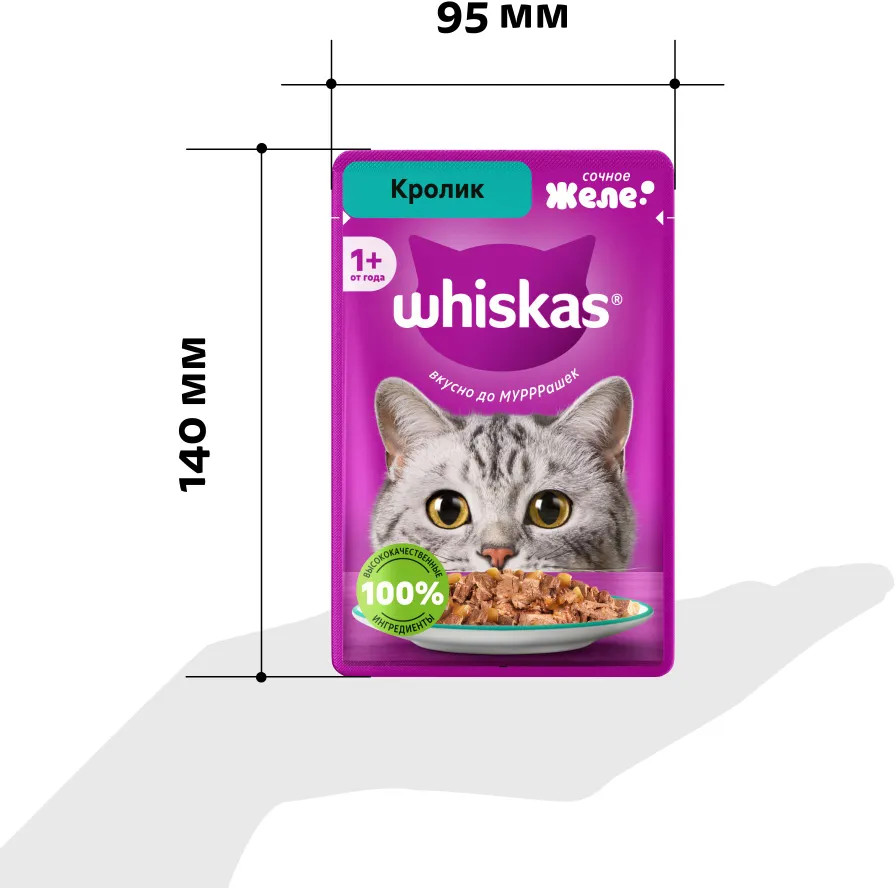 Это сбалансированный рацион, приготовленный именно так, как любит ваша кошка. Отборные мясные кусочки с телятиной в аппетитном желе придутся по вкусу вашей любимице. Рацион Whiskas содержит все необходимое, чтобы еда вашей кошки была не только вкусной, но и полезной. Whiskas поддержит иммунитет, позаботится о здоровом пищеварении и здоровье кожи и шерсти вашей кошки. Подходит для стерилизованных котов и кошек. Ваша кошка будет мурчать от удовольствия!