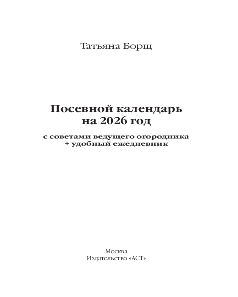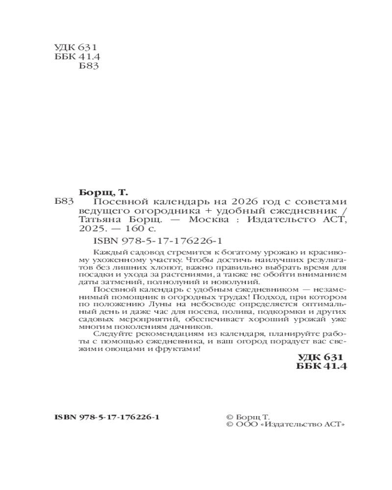 💳 Оплатить за товар можно при получении 🇰🇿 Есть бесплатная доставка по Казахстану 🎁 Копите бонусы с каждой покупки Серия: Борщ. Календари 2026 Татьяна Борщ — популярный и уважаемый в России астролог, лауреат премии Копенгагенского астрологического конгресса, телеведущая, создатель телекомпании «Астра-Арт», автор целого ряда бестселлеров. Каждый садовод стремится к богатому урожаю и красивому ухоженному участку. Чтобы достичь наилучших результатов без лишних хлопот, важно правильно выбрать время для посадки и ухода за растениями, а также не обойти вниманием даты затмений, полнолуний и новолуний. |