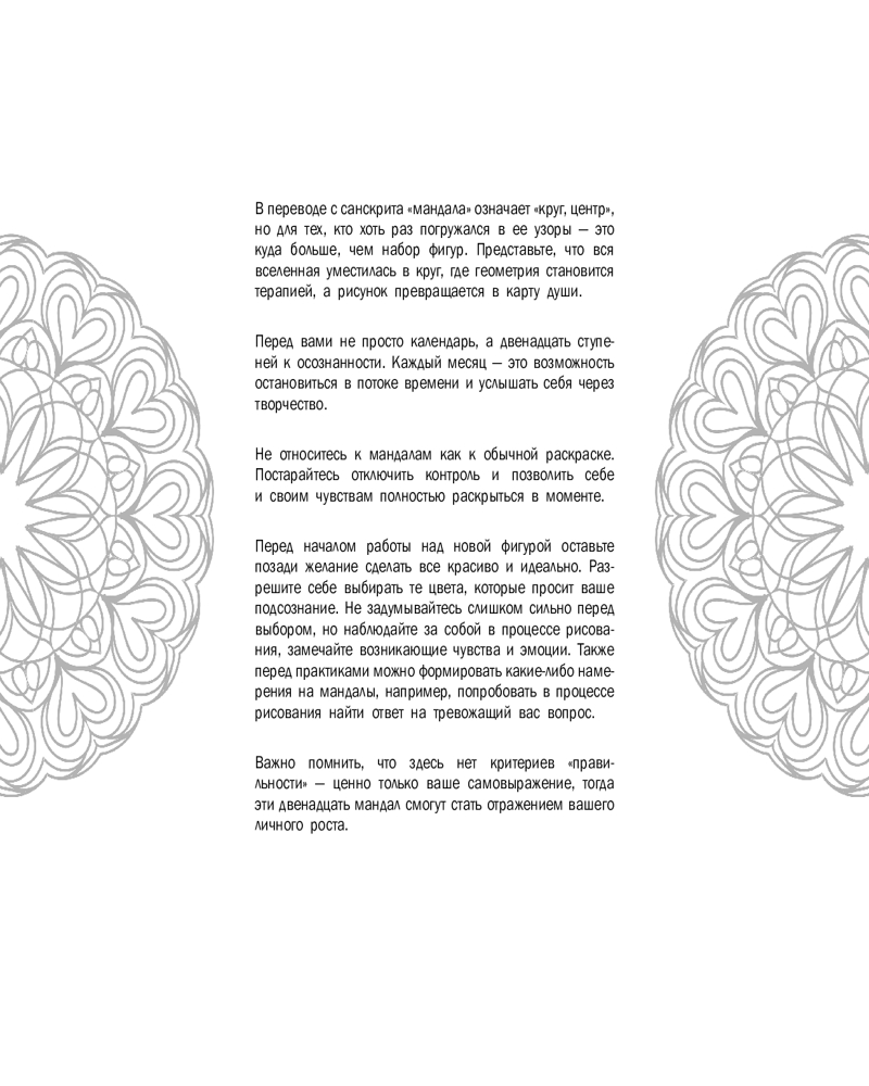 💳 Оплатить за товар можно при получении 🇰🇿 Есть бесплатная доставка по Казахстану от 1 дня 🎁 Копите бонусы с каждой покупки Серия: Календарь настенный на 2026 год Сквозь века мандалы служат мостом между земным и духовным, олицетворяя вселенную в совершенстве линий и форм. Это живые карты души, которые могут направить вас на путь самопознания. В этом календаре-раскраске вас ждут 12 мандал — 12 месяцев для творчества и осознанности. Во время работы с мандалами вы не просто рисуете — вы созидаете, наполняетесь энергией и находите баланс внутри себя. Пусть каждый штрих станет шагом к гармонии, который поможет соединиться с истинным внутренним состоянием. |