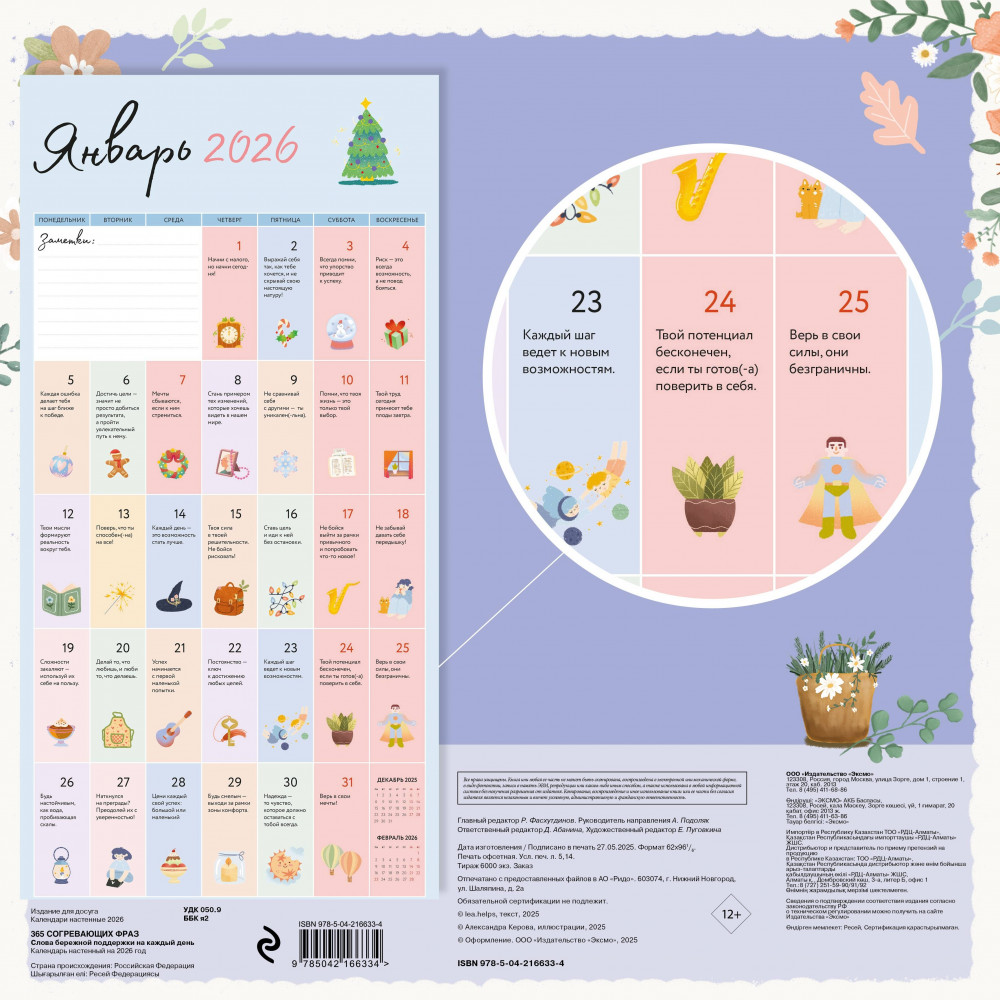 Календарь настенный на 2026 год «365 согревающих фраз. Слова бережной поддержки на каждый день»В данный момент этот товар отсутствует в продаже. Возможно, у нас найдется аналогичный или похожий товар здесь. Серия: Календари настенные 2026 (300×300) Продолжение календаря-бестселлера «365 фраз»! Обновленная сетка и нежные иллюстрации в том самом стиле, который так полюбили покупатели! Удобная сетка, милые иллюстрации, место для записи. Для всех, кто ищет ежедневную дозу мотивации и вдохновения, и для любителей спокойных оттенков и нежных цветов. |