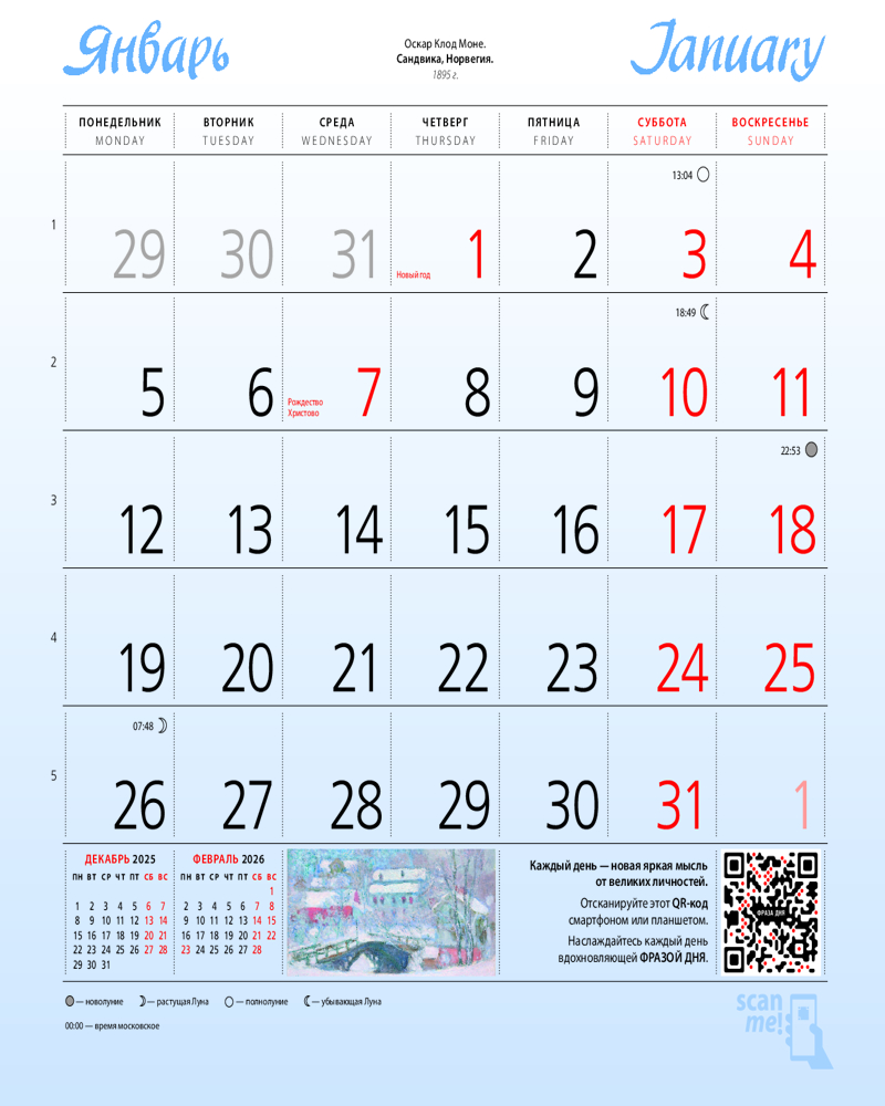 Календарь настенный на 2026 год «Импрессионисты»качество приятный подарок красивый календарь В данный момент этот товар отсутствует в продаже. Возможно, у нас найдется аналогичный или похожий товар здесь. Серия: Календари настенные 2026 (300×300) Практичный и эстетичный, этот календарь каждый месяц будет радовать вас. Прекрасные картины органично дополнят любой интерьер и помогут планировать время. В этом календаре представлены шедевры известных импрессионистов. |