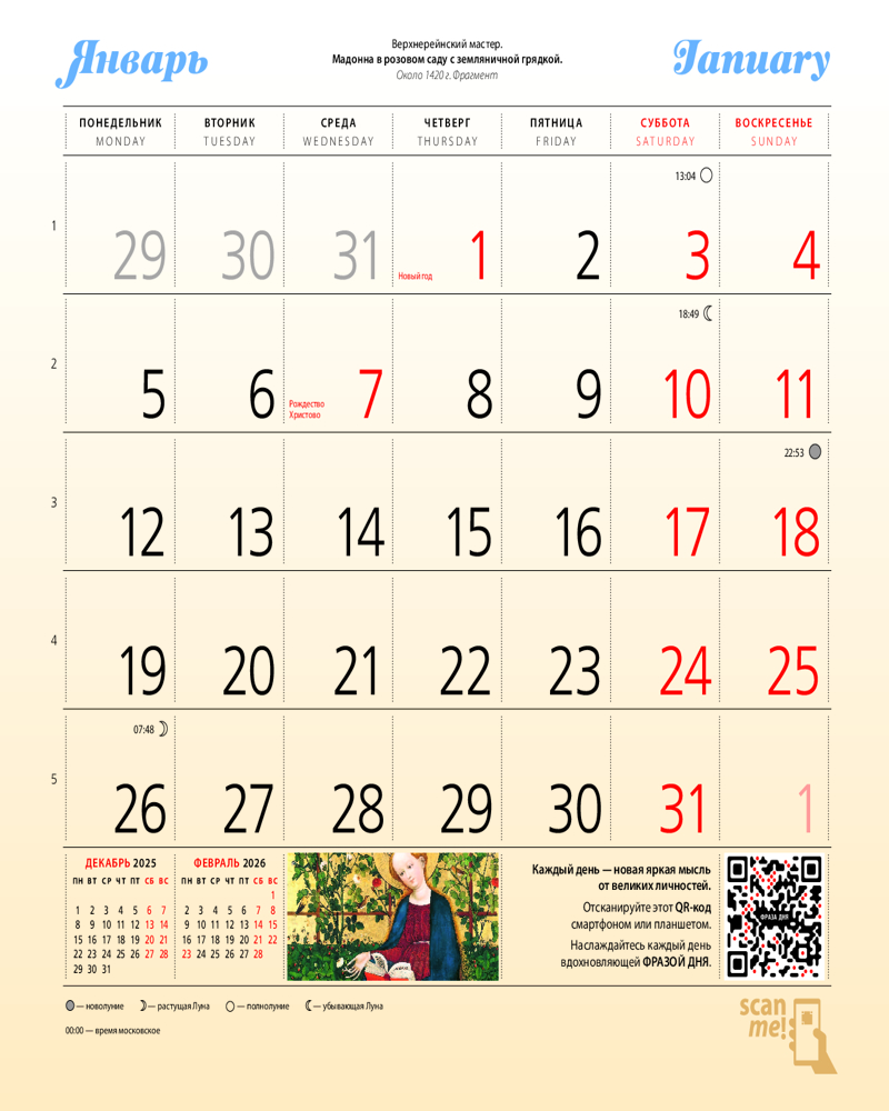 💳 Оплатить за товар можно при получении 🇰🇿 Есть бесплатная доставка по Казахстану от 1 дня 🎁 Копите бонусы с каждой покупки Серия: Календари настенные 2026 (300×300) В этом настенном перекидном календаре на 2026 год представлены знаменитые картины великих художников. Повесьте этот календарь в своем доме или на рабочем месте, и он достойно украсит любой интерьер. А календарный блок напомнит о важных событиях года. В центре календаря помещен большой арт-постер, который может стать отдельным декоративным украшением интерьера. |