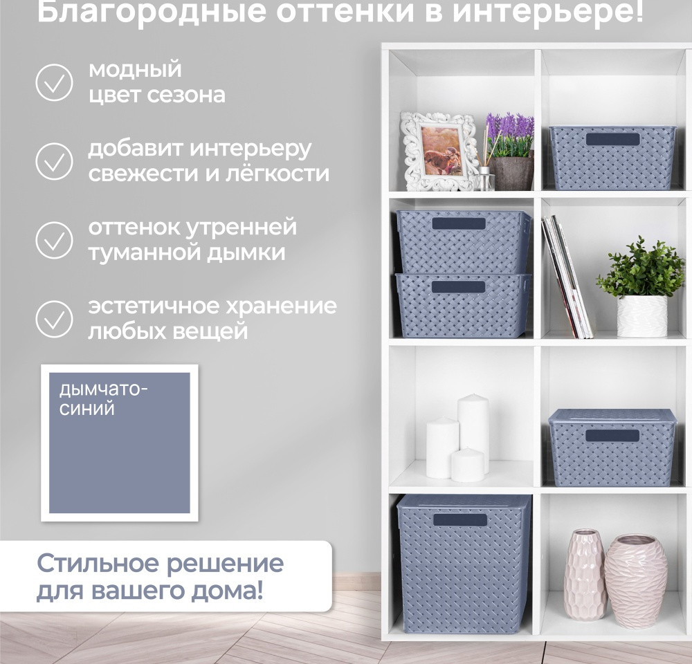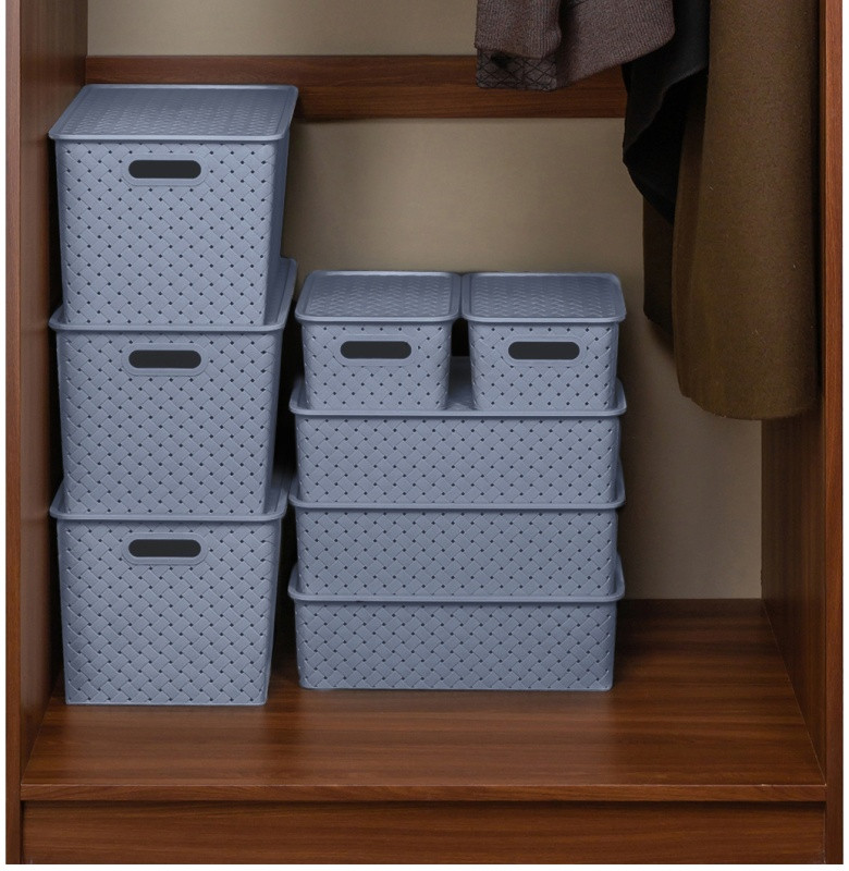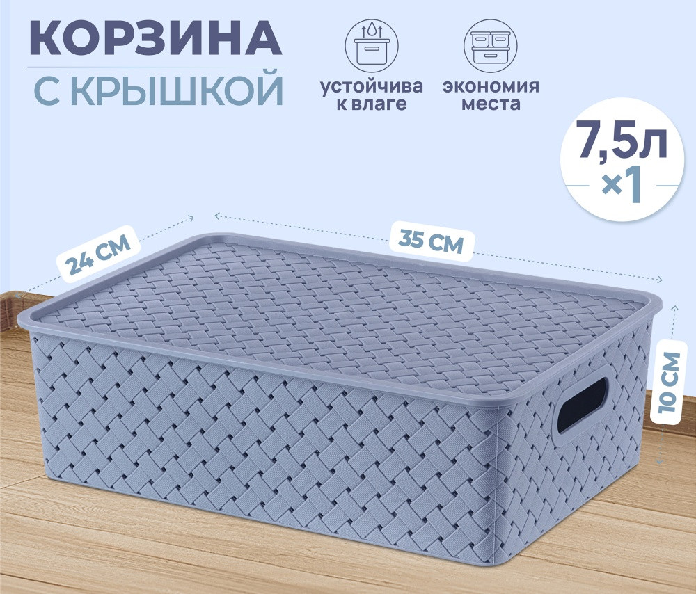 Корзинка с крышкой от El Casa дымчато-синего цвета предназначена для организации хранения вещей в вашем доме. Размер изделия — 35×24×10 см, объём — 7,5 литра. Размер дна — 32,5×21,5 см. Универсальный дизайн и благородный цвет добавят стиля вашему интерьеру. Органайзер выполнен из полипропилена и станет незаменимым помощником для поддержания порядка в гардеробной, комнате или на кухне. Преимущество данного материала над обычным пластиком в том, что он лёгкий по весу и наиболее безопасный для здоровья. В универсальном пластиковом контейнере можно хранить как овощи и фрукты, так и кухонные хозяйственные принадлежности.. Используйте ёмкость для косметики, бытовой химии и моющих средств как в шкафчике, так и в любом пространстве. Специальное плетение с дырочками позволяет воздуху проникать внутрь и не даёт продуктам испортиться от недостатка кислорода.