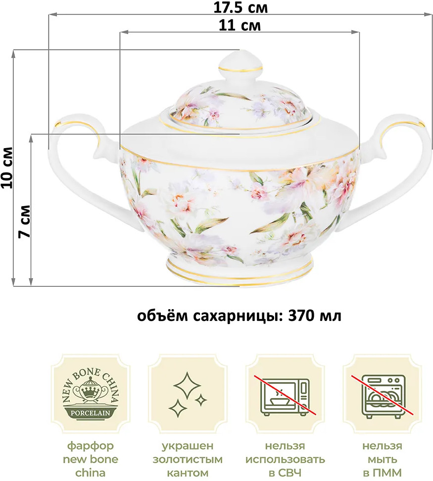 💳 Оплатить за товар можно при получении 🇰🇿 Есть бесплатная доставка по Казахстану от 1 дня 🎁 Копите бонусы с каждой покупки Серия: Корнелия Сахарница с фигурными ручками Elan Gallery «Корнелия» размером 17,5×11×10 см и объёмом 370 мл станет украшением вашей кухни. Выполнена из фарфора нового поколения new bone china. Материал сочетает в себе изящность и высокую прочность. От других видов костяного фарфора отличается большей экологичностью в производстве. Поверхность изделия овивают обворожительные белые пионы. Ёмкость подойдёт для хранения сахара, а также других продуктов, таких как варенье, мёд и даже икра. Фарфоровая баночка станет отличным элементом декора вашей кухни. Можно использовать для хранения специй и приправ, чтобы во время приготовления пищи все было под рукой. |