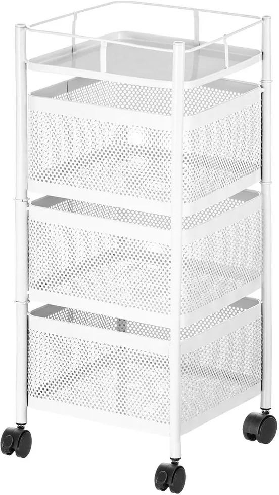 Трёхъярусная этажерка El Casa «Белая» размером 27×27×64 см на 4 колесах поможет организовать систему хранения в доме. Выполнена из металла с пудровым покрытием. Размеры верхней полки 26.5×26.5×6 см, каждого прямоугольного ящичка — 26×26×14 см, расстояние между ящиками — 2 см. Максимальная нагрузка на 1 полочку — 5 кг. Высота от пола до нижней корзины без колес 3 см, с колесами — 7.5 см.