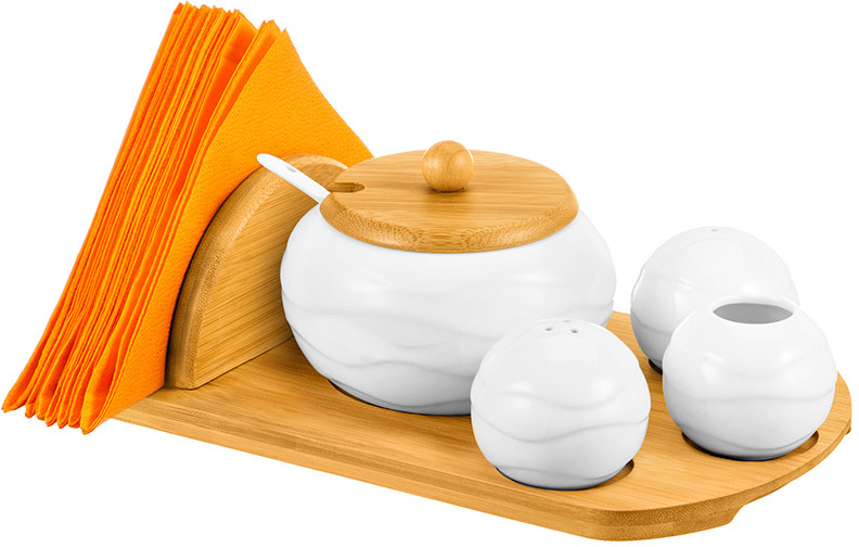 Набор посуды от Elan Gallery из серии «Айсберг волны» на бамбуковой подставке предназначен для эстетичной сервировки вашего стола. Включает в себя сахарницу с ложкой, набор для специй, вазочку под зубочистки и бамбуковую подставку с отсеком для салфеток. Фарфоровые изделия не впитывают цвет продуктов и легко отмывается, благодаря чему надолго сохраняет свою белизну. Поверхность изделий украшают рельефные узоры.