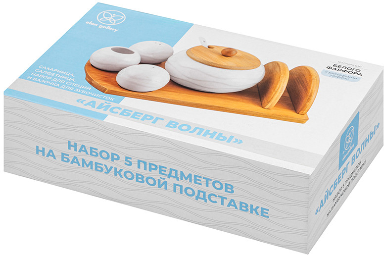 Набор для специй позволит держать под рукой соль и необходимые приправы. Баночки наполняются через отверстие снизу и закрываются пластиковой пробкой. Вазочка для зубочисток станет удобной гигиенической принадлежностью. Не рекомендуется применять абразивные моющие средства. Без бамбуковых элементов ёмкости подходят для использования в микроволновой печи и посудомоечной машине. Поставляются в дизайнерской картонной коробке — благодаря ей вам не потребуется дополнительная подарочная упаковка. Фарфоровая сервировочная посуда будет оригинальным подарком для хозяйки, ценящей не только практичность, но и привлекательность. Серия «Айсберг волны» от бренда Элан Галерея пополнит вашу коллекцию кухонного инвентаря и позволит собрать красивый сервиз в едином стиле!