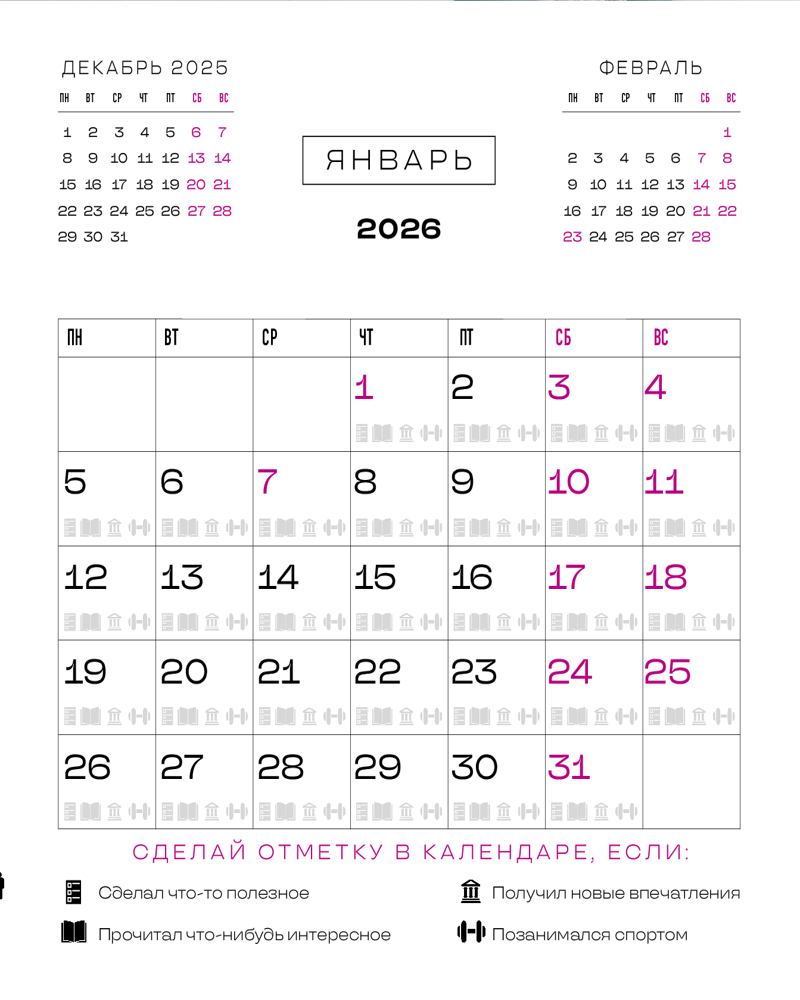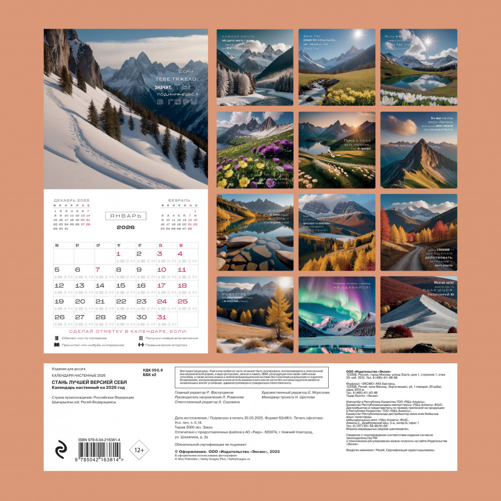 Календарь настенный на 2026 год «Стань лучшей версией себя»В данный момент этот товар отсутствует в продаже. Возможно, у нас найдется аналогичный или похожий товар здесь. Серия: Календари настенные 2026 (300×300) «Стань лучшей версией себя» — мотивационный календарь с вдохновляющими фразами и фотографиями природы, от которых захватывает дух. Трекер на сетке поможет отследить ваш прогресс в тренировках, социальных контактах, культурном и интеллектуальном развитии! |
