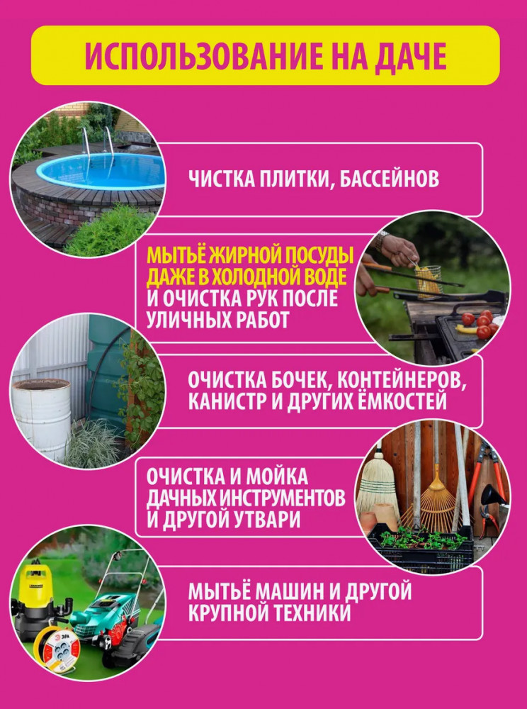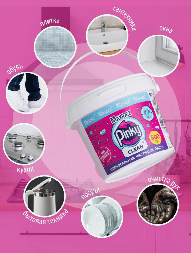 Средство идеально для мытья посуды: 1кг пасты заменяет до 15 бутылок популярного средства для посуды Фэри. Pinky Clean — чудо-паста 50 в 1 для уборки дома. Подходит как чистящее средство для кухни: посуды, плиты, микроволновки, вытяжки, духовки, гриля, холодильника, противня, казана и других поверхностей. Особой популярностью эта паста пользуется для очистки белой подошвы обуви для удаления грязи и обновления деталей обуви (кроме кожи). Яркая розовая паста поднимет настроение, а уборка дома станет удовольствием.