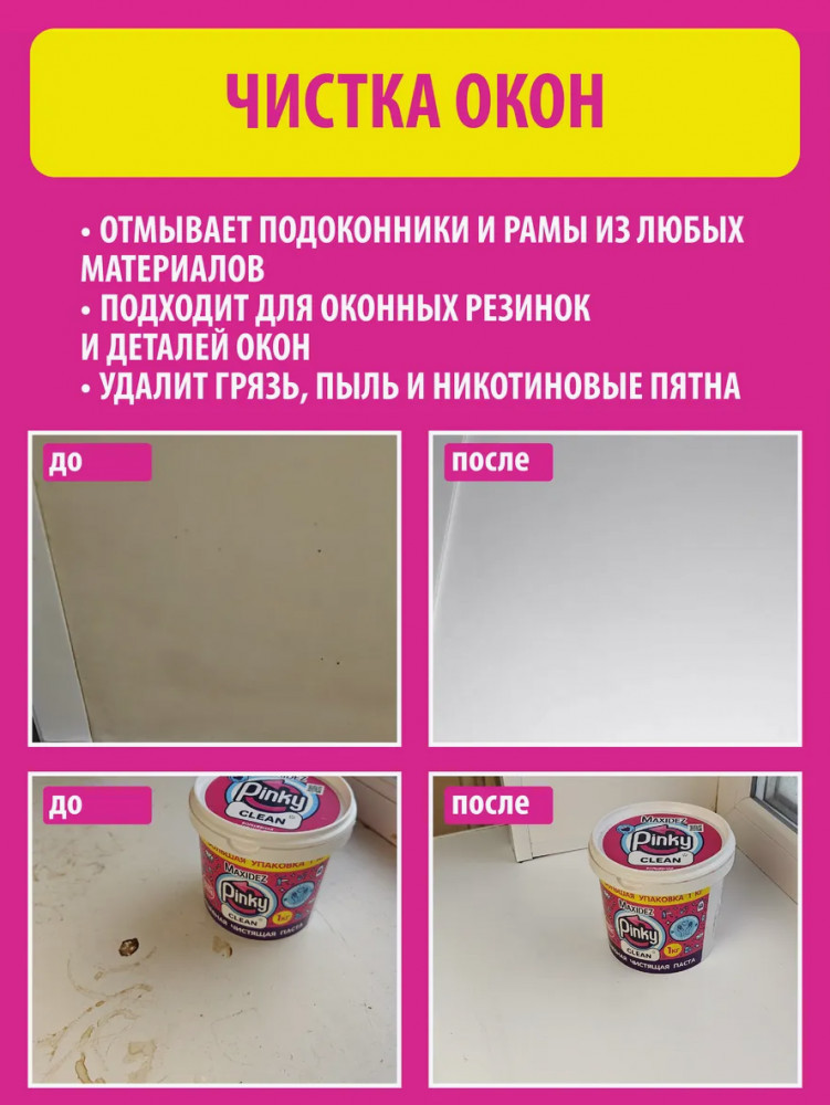 Чистящее средство для пластиковых подоконников и рам, мытья пластиковых окон, а также для легкой очистки хромированных кранов от известкового налета (от известковой сеточки) в ванной, очистит межплиточные швы на кафеле, поможет очистить ванну из эмали и акрила до блеска. Подходит для акриловых ванн. Выручает паста Pinky Clean каждую хозяйку. |