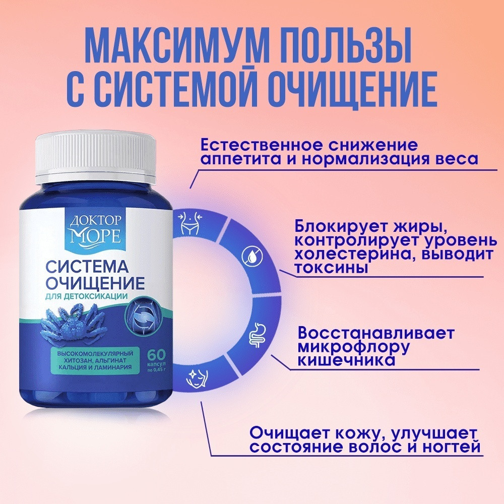 Очищение организма, оздоровление кишечника и восстановление собственной микрофлоры. Первый шаг на пути к снижению веса, сильному иммунитету и чистой коже! Система Очищение — это первый и единственный морской комплекс из 3 морских очищающих ингредиентов — хитозана, альгината кальция и ламинарии — для «генеральной уборки» вашего организма. Способствует нормализации веса за счет снижения аппетита, блокировки жира из пищи и нормализации обменных процессов.