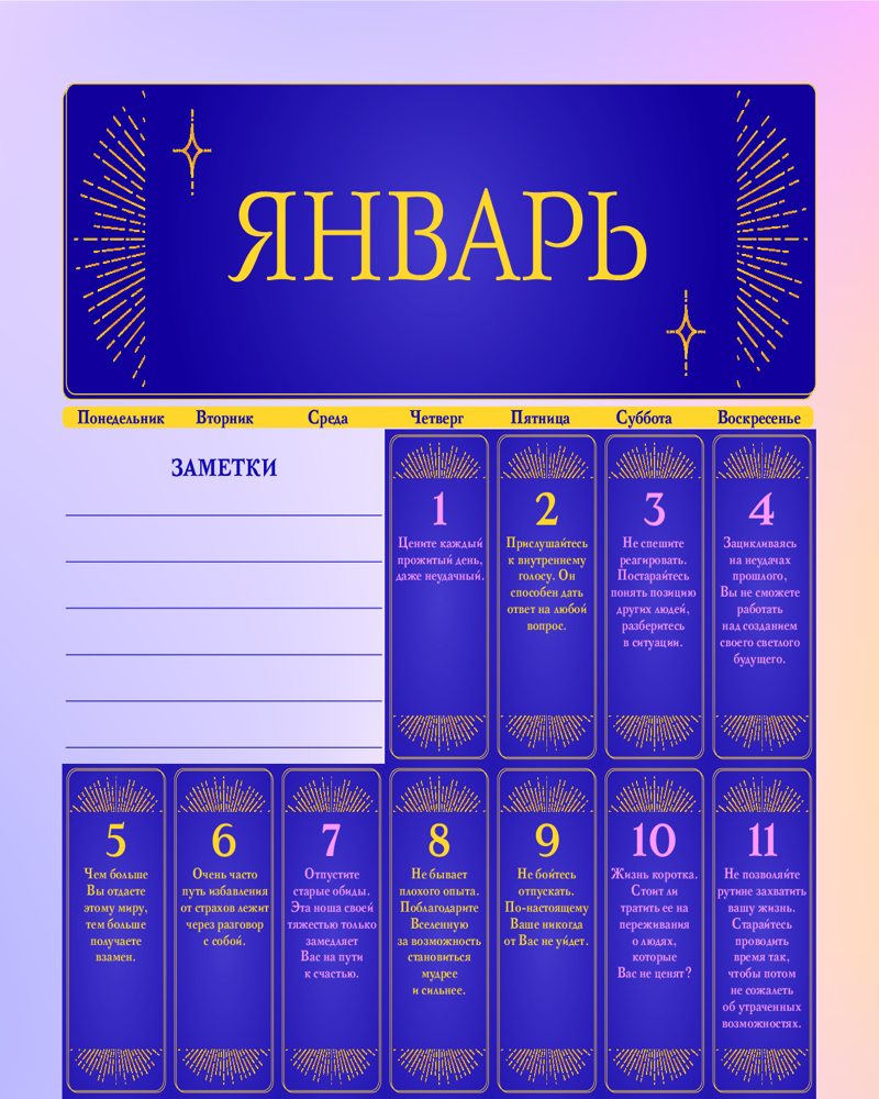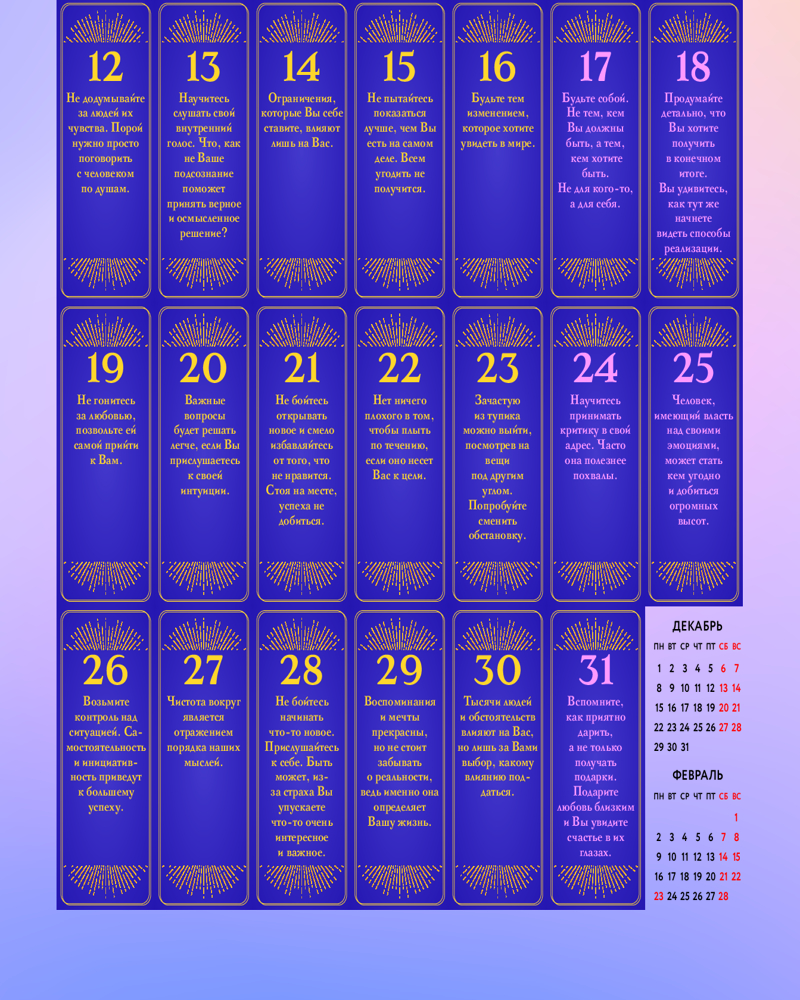 Серия: Календари настенные 2026 (300×300) В хаотичном мире часто приходится отвлекаться на бесконечный поток дел и мыслей, и это отдаляет нас от истинных желаний и потребностей. Календарь с Подсказками Вселенной призван успокоить ум и пробудить ваши истинные желания! Каждый новый день вас будет ждать вдохновляющая подсказка, мягкий совет или напоминание о чем-то важном. Удобный формат 300×300 мм позволит повесить календарь абсолютно везде и любоваться им круглый год. Доверьтесь Вселенной — она знает, что вам нужно! |