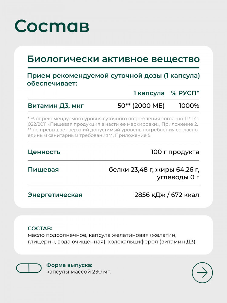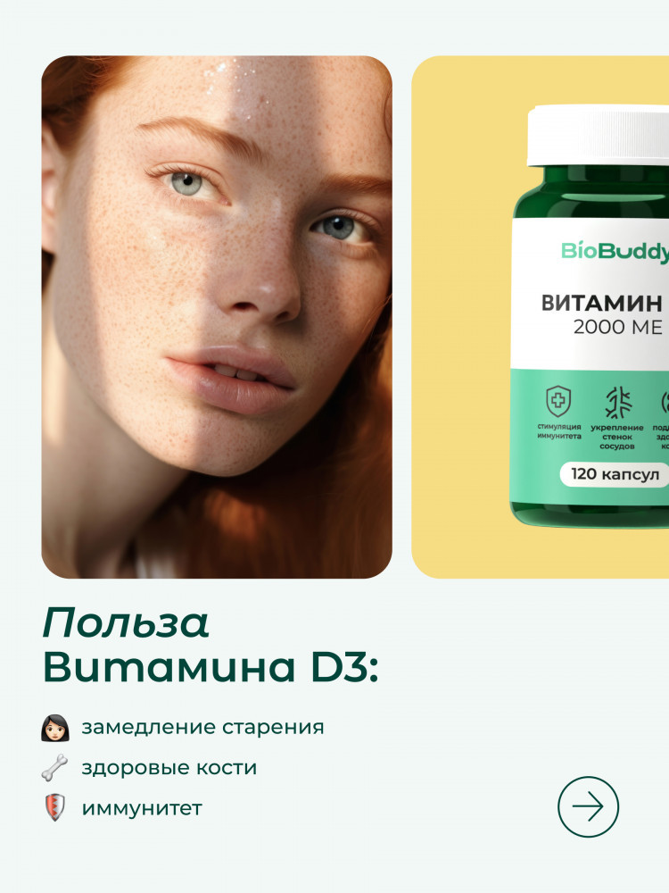 В данный момент этот товар отсутствует в продаже. Возможно, у нас найдется аналогичный или похожий товар здесь. Витамин D3 2000 МЕ в капсулах от BioBuddy — мощная поддержка иммунитета, энергии и настроения. Витамин D 3 (холекальциферол) участвует в усвоении кальция и фосфора в организме, обеспечивая здоровье костей, мышц, сердечно-сосудистой и иммунной системы. Рекомендуется взрослым для профилактики дефицита. Подходит для повседневной заботы о самочувствии. Особенно важен в осенне-зимний период.