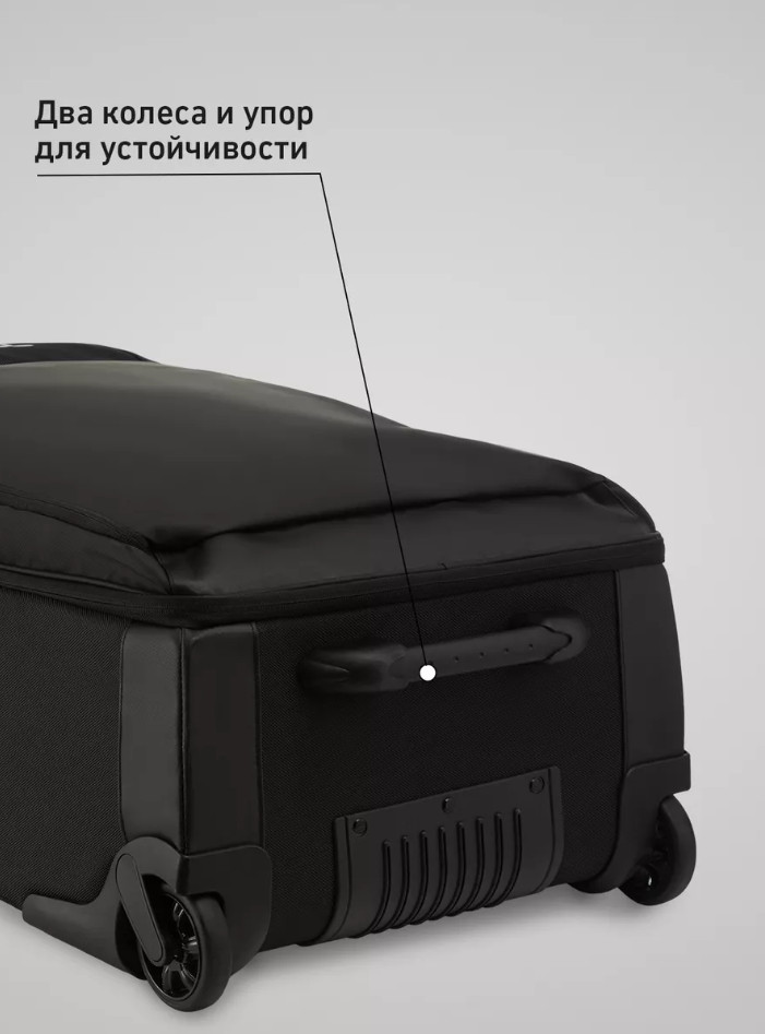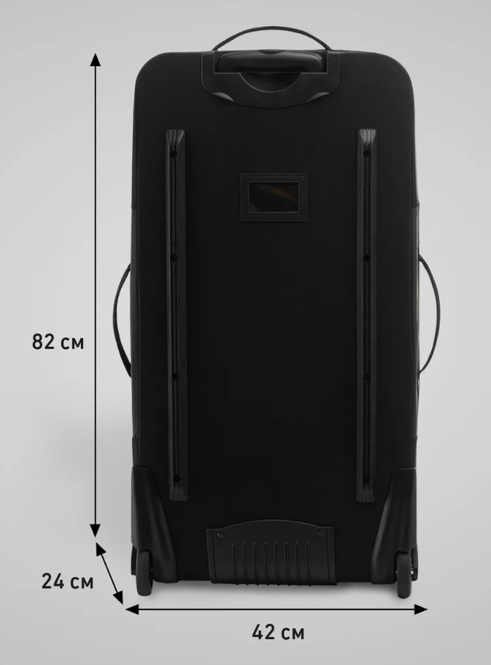 Чемодан имеет две вместительных секции: внутреннее отделение дополнено стяжными резинками для фиксации одежды, второй отсек застегивается на молнию для удобства упаковки вещей. Для быстрого доступа к важным мелочам предусмотрены два внешних кармана на молнии. Чемодан объемом 80 л вместителен и позволяет взять с собой все необходимое для длинных командировок или отдыха. Функциональность и лаконичный дизайн понравится и спортсменам, такую модель можно использовать для экипировки команд в едином стиле.