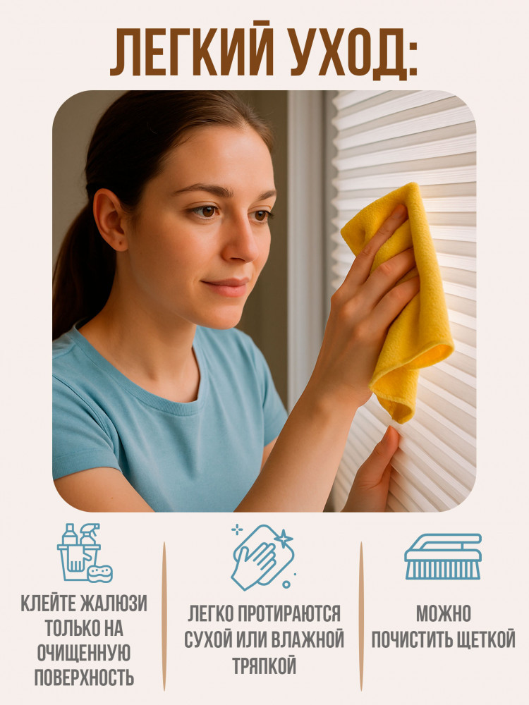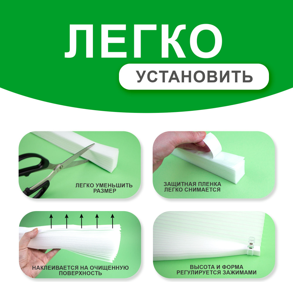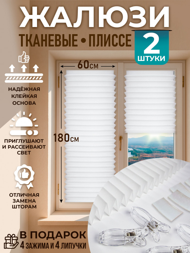 Жалюзи самоклеящиеся на окна полиэстер — комплект 2шт размером 60×180 см — это идеальное решение для тех, кто ищет легкий способ управления светом и приватностью в комнате при минимальных затратах. Тканевые жалюзи плиссе идеально подойдут под стандартные размеры пластиковых окон ПВХ, могут быть закреплены на стеклянной, пластиковой или деревянной поверхности. Изготовленные из прочной ткани полиэстер, жалюзи имеют гладкую поверхность и мягкий, но прочный складчатый дизайн, который позволяет легко регулировать уровень освещения, видимости или блэкаута в помещении. Благодаря своей универсальности и доступности, вертикальные плиссе станут отличным выбором для любого интерьера — от современного до классического. Самоклеящиеся жалюзи на липучке укомплектованы зажимом, благодаря которому она фиксируется в любом положении. Жалюзи прекрасно сочетаются с другими элементами декора и могут быть легко установлены на любое окно благодаря самоклеящейся основе. Кроме того, они легко чистятся и не требуют особого ухода, что делает их еще более практичными. Если вы хотите создать комфортную и функциональную атмосферу в вашем доме, то жалюзи день ночь — это именно то, что вам нужно!