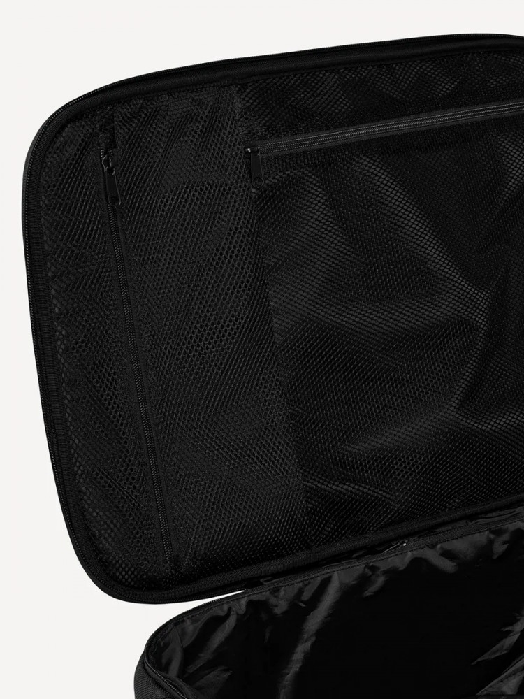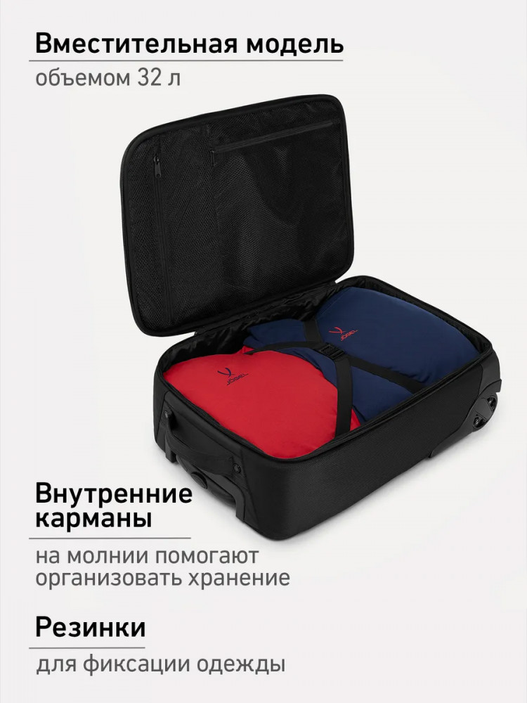 Чемодан имеет вместительную внутреннюю секцию, дополненную стяжными резинками для фиксации одежды. Дополнительные сетчатые отсеки внутри помогают организовать хранение небольших вещей и застегиваются на молнии. Для быстрого доступа к важным мелочам предусмотрены два внешних кармана на молнии. Чемодан объемом 32 л позволяет взять с собой все необходимое для непродолжительных командировок или отдыха. Функциональность и лаконичный дизайн понравятся и спортсменам, такую модель можно использовать для экипировки команд в едином стиле.