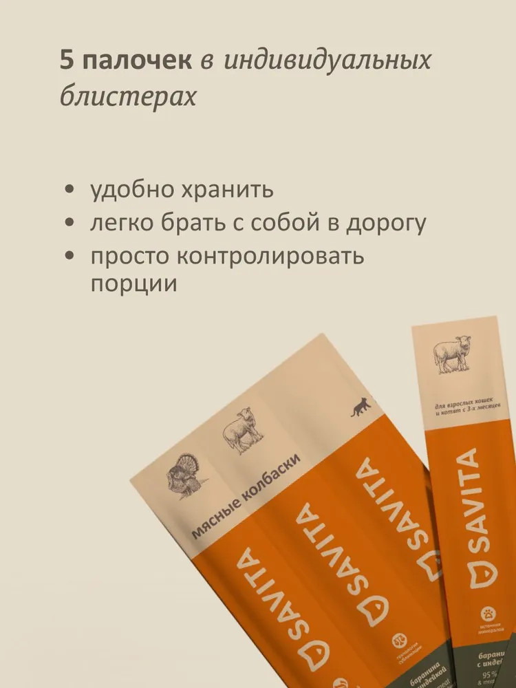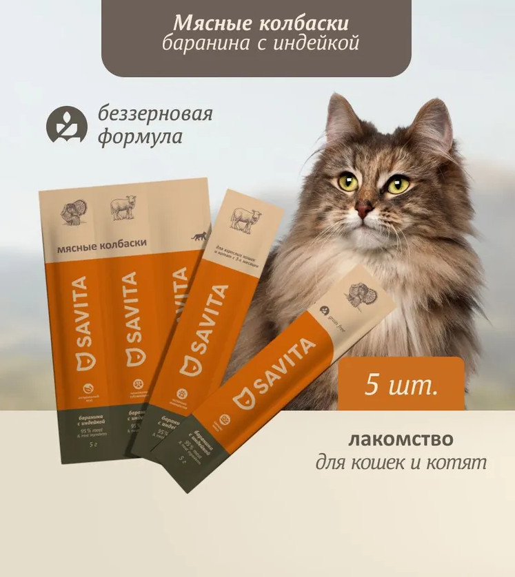 Savita Колбаски для кошек и котят мясные «Свежая баранина с индейкой»