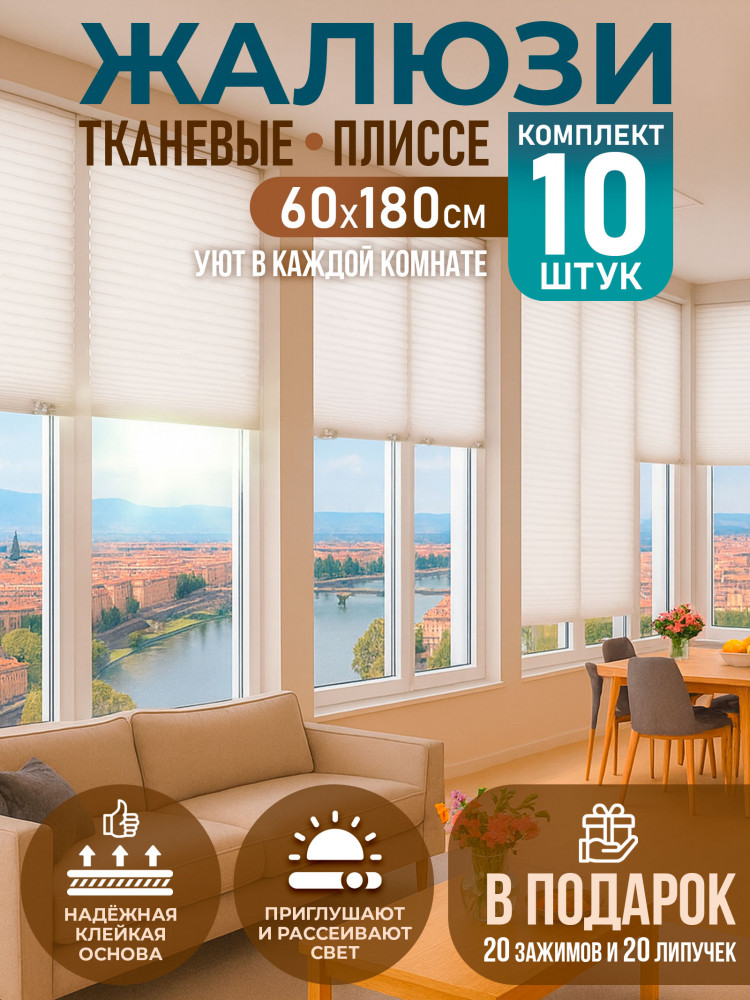 Жалюзи самоклеящиеся на окна полиэстер — комплект 10 шт. размером 60×180 см — это идеальное решение для тех, кто ищет легкий способ управления светом и приватностью в комнате при минимальных затратах. Тканевые жалюзи плиссе идеально подойдут под стандартные размеры пластиковых окон ПВХ, могут быть закреплены на стеклянной, пластиковой или деревянной поверхности. Изготовленные из прочной ткани полиэстер, жалюзи имеют гладкую поверхность и мягкий, но прочный складчатый дизайн, который позволяет легко регулировать уровень освещения, видимости или блэкаута в помещении. Благодаря своей универсальности и доступности, вертикальные плиссе станут отличным выбором для любого интерьера — от современного до классического. Самоклеящиеся жалюзи на липучке укомплектованы зажимом, благодаря которому она фиксируется в любом положении. Жалюзи прекрасно сочетаются с другими элементами декора и могут быть легко установлены на любое окно благодаря самоклеящейся основе. Кроме того, они легко чистятся и не требуют особого ухода, что делает их еще более практичными. Если вы хотите создать комфортную и функциональную атмосферу в вашем доме, то жалюзи день ночь — это именно то, что вам нужно!