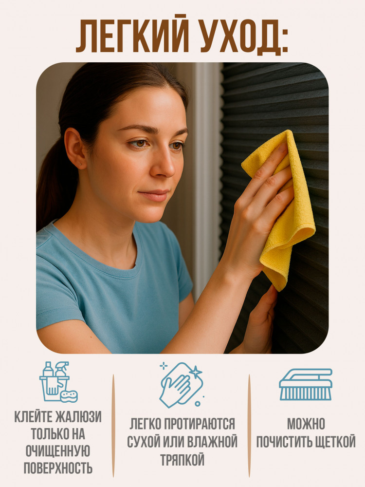 Жалюзи самоклеящиеся на окна полиэстер — комплект 2 шт. размером 60×180 см — это идеальное решение для тех, кто ищет легкий способ управления светом и приватностью в комнате при минимальных затратах. Тканевые жалюзи плиссе идеально подойдут под стандартные размеры пластиковых окон ПВХ, могут быть закреплены на стеклянной, пластиковой или деревянной поверхности. Изготовленные из прочной ткани полиэстер, жалюзи имеют гладкую поверхность и мягкий, но прочный складчатый дизайн, который позволяет легко регулировать уровень освещения, видимости или блэкаута в помещении. Благодаря своей универсальности и доступности, вертикальные плиссе станут отличным выбором для любого интерьера — от современного до классического. Самоклеящиеся жалюзи на липучке укомплектованы зажимом, благодаря которому она фиксируется в любом положении. Жалюзи прекрасно сочетаются с другими элементами декора и могут быть легко установлены на любое окно благодаря самоклеящейся основе. Кроме того, они легко чистятся и не требуют особого ухода, что делает их еще более практичными. Если вы хотите создать комфортную и функциональную атмосферу в вашем доме, то жалюзи день ночь — это именно то, что вам нужно!