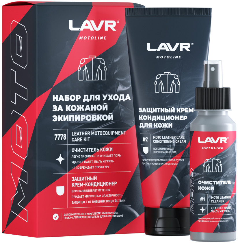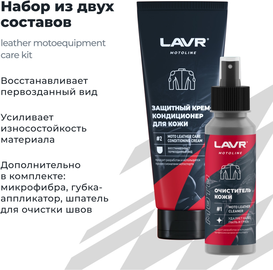 Набор из двух специальных составов для очистки эксплуатационных загрязнений, ухода, восстановления и защиты мотоаммуниции из натуральной, искусственной и экокожи: экипировки, перчаток, седла и кофров