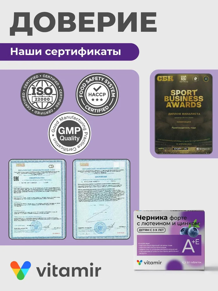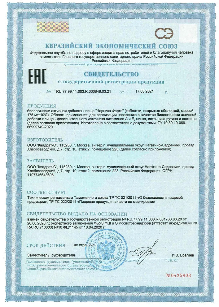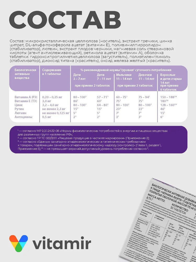 • экстракт черники способствует улучшению кровообращения в тканях глаза и доставки кислорода в сетчатку. Из плодов черники выделено много полезных для здоровья веществ — сахара, органические кислоты и витамины, но наиболее важными являются антоцианы, которые придают плодам иссиня-черный цвет. Антоцианы обладают мощной антиоксидантной активностью, снижают проницаемость и ломкость капилляров. Еще эти вещества способствуют восстановлению светочувствительного пигмента сетчатки — родопсина и тем самым улучшают чувствительность сетчатки к различным уровням светового излучения и могут усиливать остроту зрения при низкой освещенности. Ретинол (витамин A). В сетчатке глаза имеются особые фоторецепторные клетки — палочки, которые отвечают за черно-белое сумеречное зрение, и колбочки, обеспечивающие цветное дневное зрение. Они богаты специфическим белком, который при связывании с производным витамина А образует пигменты, ответственные за образование и передачу в головной мозг определенного сигнала. Именно этот сигнал и ощущается как «зрение». Кроме того, витамин А обеспечивает нормальное функционирование слизистых оболочек глаз, препятствуя возникновению их сухости;
