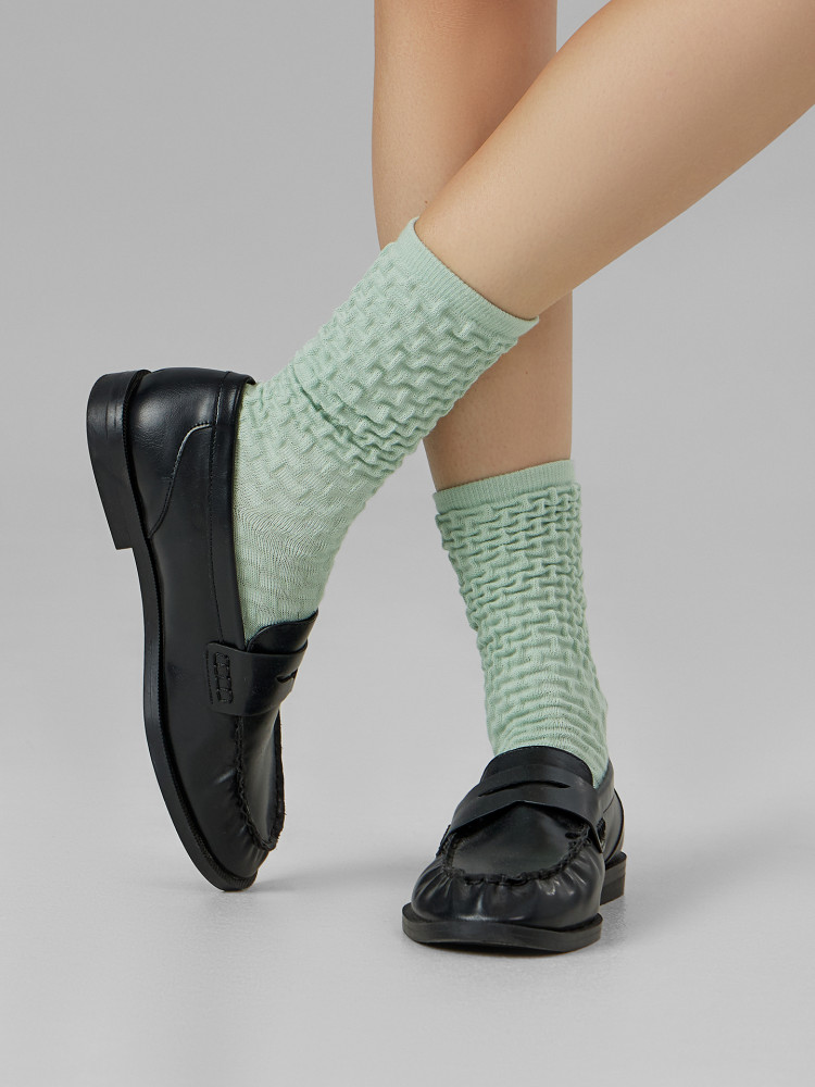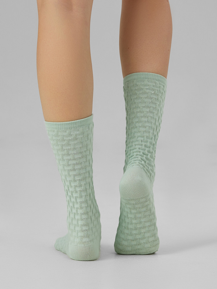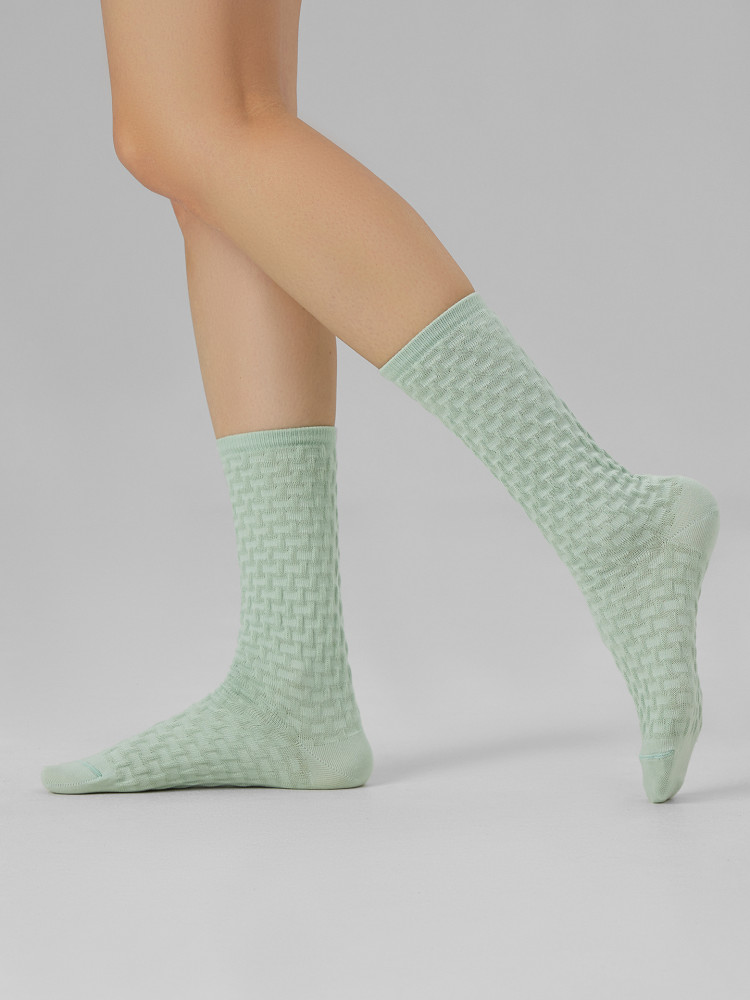 Купила сестре на размер больше, меньшего не было, интересный цвет - эвкалипт, похож на цвет мята. Ей нужны были такие длинные, как гольфы и хлопковые. Любим товары из Беларуси.
