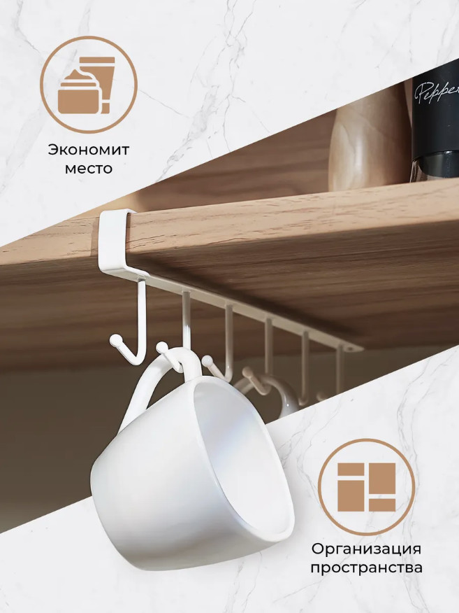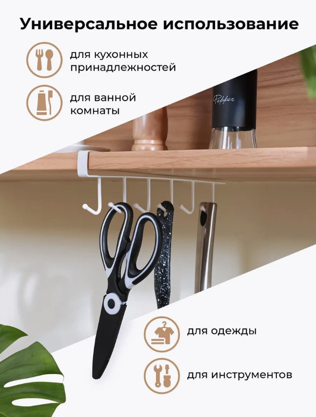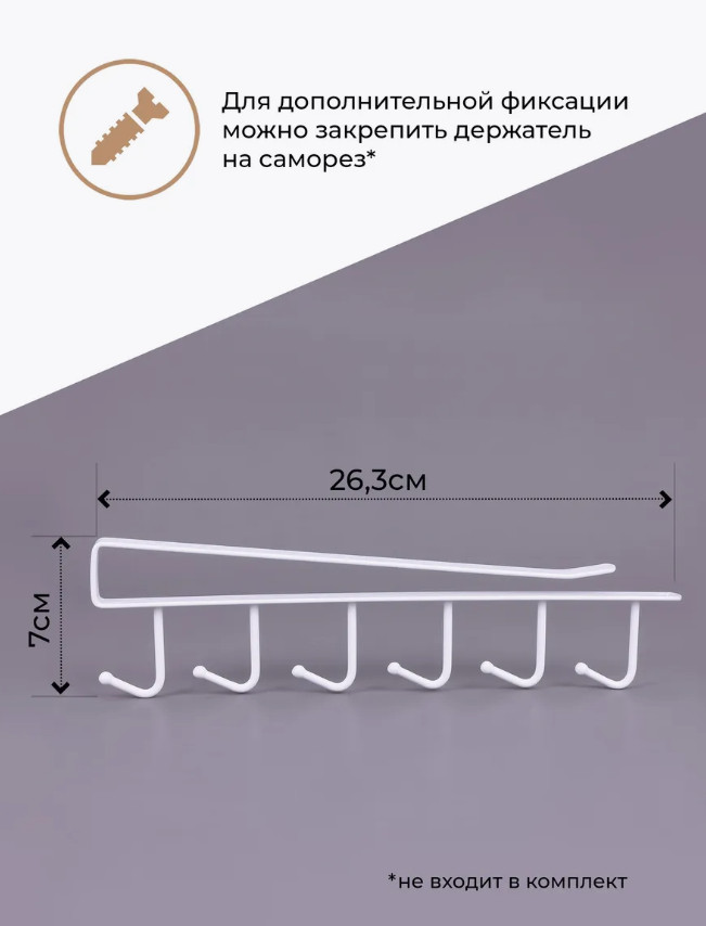 Подвесной держатель с крючками для кружек и кухонных принадлежностей - практичное и универсальное решение для организации пространства на кухне. Размер 26.3×7 см. Подвесной держатель-органайзер устанавливается легко, быстро и безопасно не повреждая кухонный фасад. Кухонный подвесной органайзер можно установить без сверления на полку в шкаф или на дверь в вертикальном положении. Уникальность кухонного держателя с 6-ю крючками заключается в его многофункциональности: можно хранить чашки, кружки, половники, венчики, кухонные щипцы, силиконовые лопатки, разделочные доски, а также другую кухонную утварь и аксессуары для приготовления.