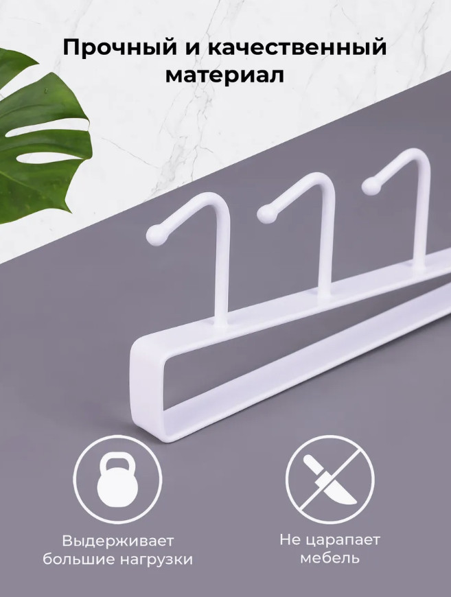 Не ограничиваясь кухней, универсальный держатель с крючками в гардеробной или шкафу преобразится в функциональную вешалку для хранения вещей, галстуков, ремней, сумок и шарфов. В ванной комнате на подвесной держатель с крючками можно повесть полотенце, мочалки, массажные щетки и халаты для душа. Сделанный из прочного металла, подвесной кухонный держатель с крючками гарантирует надежность и долгий срок службы. Крючки кухонные представлены в классическом белом цвете, поэтому легко впишутся в дизайн любой кухни. Организуйте порядок и грамотное хранение в каждом уголке дома и дачи.