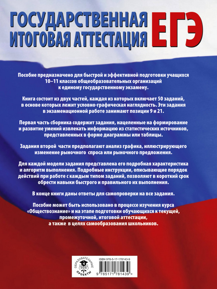 💳 Оплатить за товар можно при получении 🇰🇿 Есть бесплатная доставка по Казахстану от 1 дня 🎁 Копите бонусы с каждой покупки Серия: Подготовка к единому государственному экзамену Пособие предназначено для быстрой и эффективной подготовки учащихся 10-11 классов общеобразовательных организаций к единому государственному экзамену. Книга состоит из двух частей, каждая из которых включает 50 заданий, в основе которых лежит условно-графическая наглядность. Эти задания в экзаменационной работе занимают позиции 9 и 21. Первая часть сборника содержит задания, нацеленные на формирование и развитие умений извлекать информацию из статистических источников, представленных в форме диаграммы или таблицы. Задания второй части предполагают анализ графика, иллюстрирующего изменение рыночного спроса или рыночного предложения. |