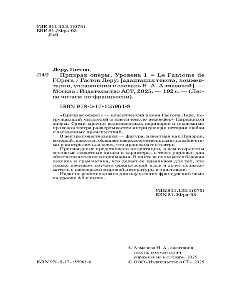 💳 Оплатить за товар можно при получении 🇰🇿 Есть бесплатная доставка по Казахстану от 1 дня 🎁 Копите бонусы с каждой покупки Серия: Легко читаем по-французски «Призрак оперы» — классический роман Гастона Леру, погружающий читателей в мистическую атмосферу Парижской оперы. Среди мрачно великолепных коридоров и подземных проходов театра развертывается интригующая история любви и загадочных происшествий. В центре повествования — фигура, известная как Призрак, который, кажется, обладает сверхъестественными способностями и контролем над всем, что происходит в театре. Произведение представлено в адаптации, в нем сохранены основные сюжетные линии и характеры, а текст упрощен для облегчения чтения и понимания. В книге используется базовая лексика и грамматика, что делает ее идеальной для тех, кто только начинает изучать французский язык и хочет познакомиться с шедеврами мировой литературы в оригинале. Издание рекомендовано для изучающих французский язык на уровне A2 и выше. |