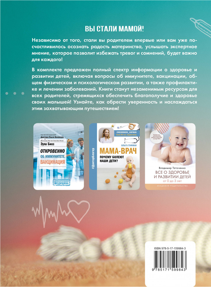 Здоровье ребенка. Большая книга простых правил для каждой мамы. Комплект из 3 книгБисс Эула, Владимир Кириллович Таточенко, Ольга Рафаиловна Гофман В данный момент этот товар отсутствует в продаже. Возможно, у нас найдется аналогичный или похожий товар здесь. Независимо от того, стали вы родителем впервые или вам уже посчастливилось осознать радость материнства, услышать экспертное мнение, которое позволит избежать тревог и сомнений, будет важно для каждого! |
