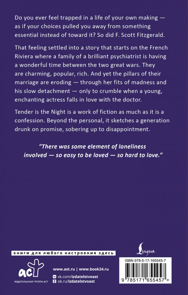 💳 Оплатить за товар можно при получении 🇰🇿 Есть бесплатная доставка по Казахстану от 1 дня 🎁 Копите бонусы с каждой покупки Серия: Exclusive Classics Paperback Эта история берет начало в ревущие двадцатые на французской Ривьере, где отдыхает семья талантливого доктора-психиатра из Америки. Они любимы, обаятельны, богаты — и счастливы. Так, во всяком случае, думает юная актриса, влюбленная в доктора, пока не слышит нечеловеческий вой, доносящийся из ванной. А доктор, женившийся на пациентке, думает о том, что с каждым «правильным» шагом он становится все дальше от чего-то бесконечно важного. «Ночь нежна» — это не только роман, но и исповедь Фрэнсиса Скотта Фицджеральда. Это книга о поколении, которому пообещали слишком много, и о любви, которая не спасает. |