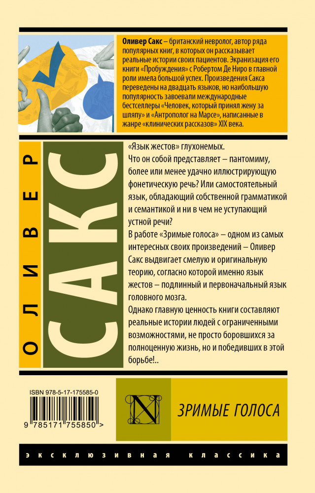 💳 Оплатить за товар можно при получении 🇰🇿 Есть бесплатная доставка по Казахстану от 1 дня 🎁 Копите бонусы с каждой покупки Серия: Эксклюзивная классика «Язык жестов» глухонемых. Что он собой представляет — пантомиму, более или менее удачно иллюстрирующую фонетическую речь? Или самостоятельный язык, обладающий собственной грамматикой и семантикой и ни в чем не уступающий устной речи? В работе «Зримые голоса» — одном из самых интересных своих произведений — Оливер Сакс выдвигает смелую и оригинальную теорию, согласно которой именно язык жестов — подлинный и первоначальный язык головного мозга. Однако главную ценность книги составляют реальные истории людей с ограниченными возможностями, не просто боровшихся за полноценную жизнь, но и победивших в этой борьбе!.. |