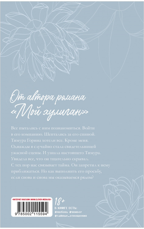 Все пытались с ним познакомиться. Войти в его компанию. Шептались за его спиной. Тимура Горина хотели все. Кроме меня. Однажды я стала случайной свидетельницей ужасной сцены. И узнала настоящего Тимура. Увидела все, что он тщательно скрывал. С тех пор нас связывает тайна. Он запретил к нему приближаться. Но как выполнить его просьбу, если снова и снова мы оказываемся рядом? |
