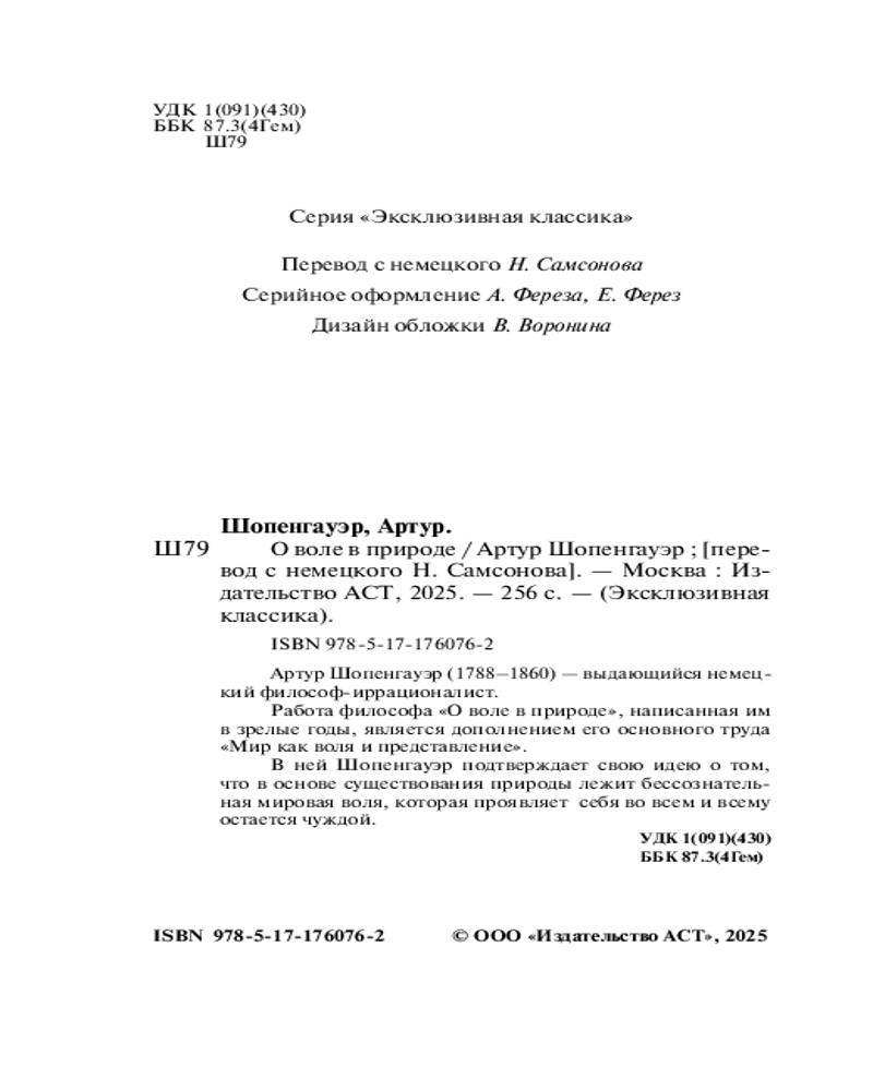 💳 Оплатить за товар можно при получении 🇰🇿 Есть бесплатная доставка по Казахстану от 1 дня 🎁 Копите бонусы с каждой покупки Серия: Эксклюзивная классика Артур Шопенгауэр (1788-1860) — выдающийся немецкий философ-иррационалист. Работа философа «О воле в природе», написанная им в зрелые годы, является дополнением его основного труда «Мир как воля и представление». В ней Шопенгауэр подтверждает свою идею о том, что в основе существования природы лежит бессознательная мировая воля, которая проявляет себя во всем и всему остается чуждой. |