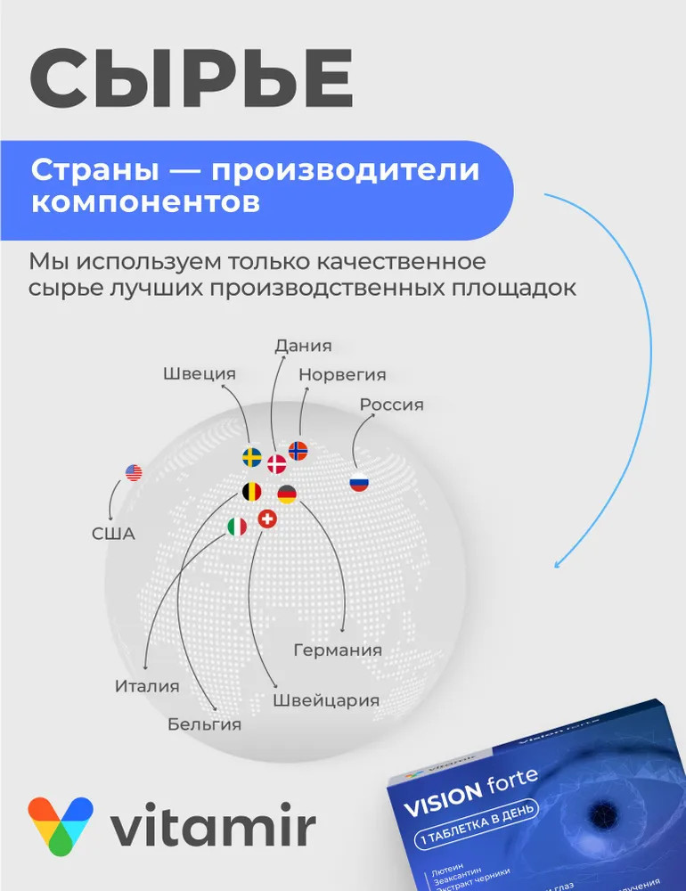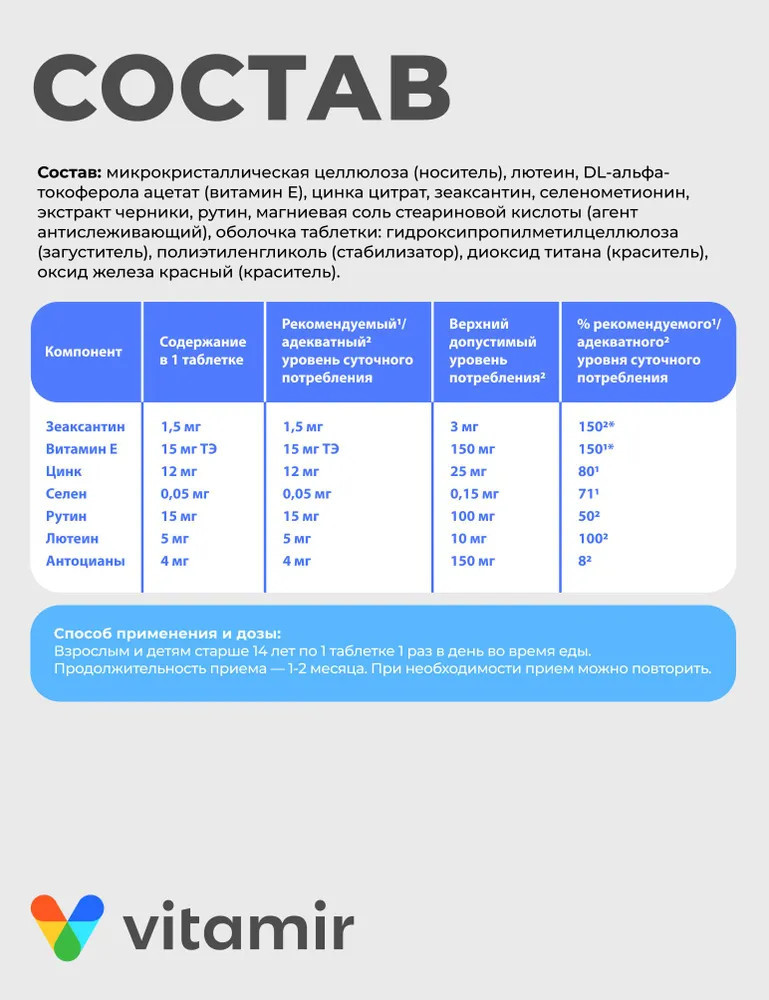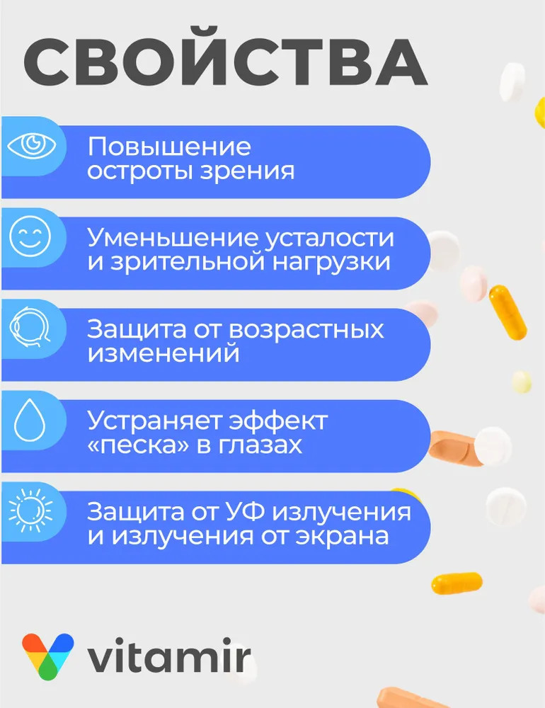 Витамир Таблетки для остроты зрения «Vision Forte»В данный момент этот товар отсутствует в продаже. Возможно, у нас найдется аналогичный или похожий товар здесь. Глаза — уникальный дар природы, с помощью которого человеческий мозг получает до 90% информации. К сожалению, не все мы уделяем должное внимание поддержанию их здоровья. Многих проблем со зрением можно избежать при соблюдении определенного комплекса профилактических мероприятий, к которым, в том числе, относится употребление витаминно-минеральных комплексов. «Vision Forte» — продукт, который способствует сохранению зрения и защите глаз в условиях повышенной зрительной нагрузки. |