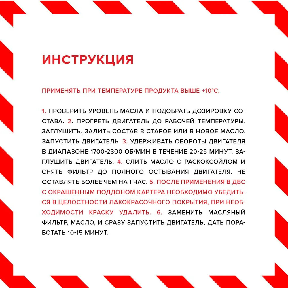 Состав предназначен для очистки масляной системы бензиновых и дизельных ДВС от низко- и высокотемпературных углеродистых отложений: лак, нагар, шлам. Состав растворяет в масле труднорастворимые вещества, исключая вероятнось закупорки маслооотводящих каналов и задира абразивными частицами. Эффективен для раскоксовки маслоотводящих каналов, маслосъемных колец, чистки гидрокомпенсаторов и других элементов ДВС, контактирующих с маслом без разбора ДВС.