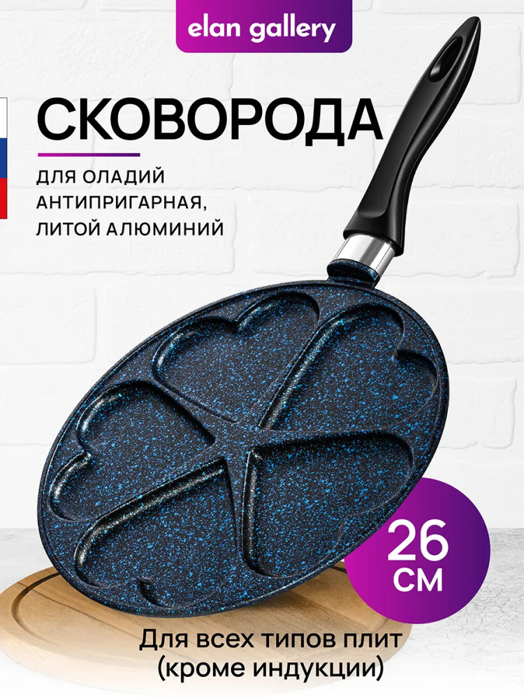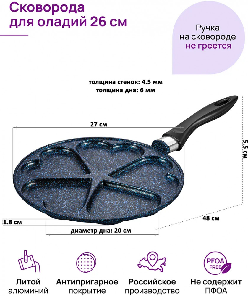 Классная сковорода, ничего не прилипает, оладьи получается в форме сердца, не маленькие, а в самый раз. Рекомендую к покупке.