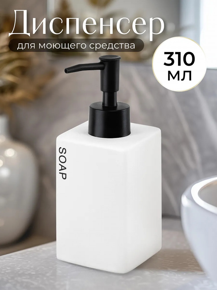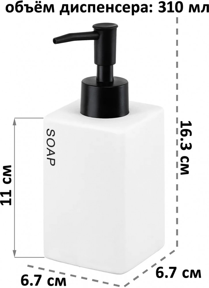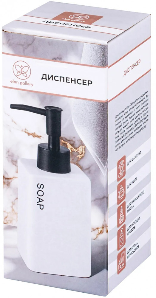 Диспенсер от бренда Elan Gallery объёмом 310 мл и размером 6,7×6,7×16,3 см поможет организовать чистоту и уют в вашем доме. Украшен надписью «Soap» («Мыло»). Стильный аксессуар в ванной или на кухне украсит интерьер, а также обеспечит быстрый доступ к средствам гигиены. Прямоугольная бутылочка выполнена из керамики. Дозатор на флаконе изготовлен из пластика. Объём керамической ёмкости 310 мл позволит налить в неё достаточно жидкости, чтобы хватило для длительного использования. Дозатор легко снимается и одевается, выдает нужную порцию мыла.