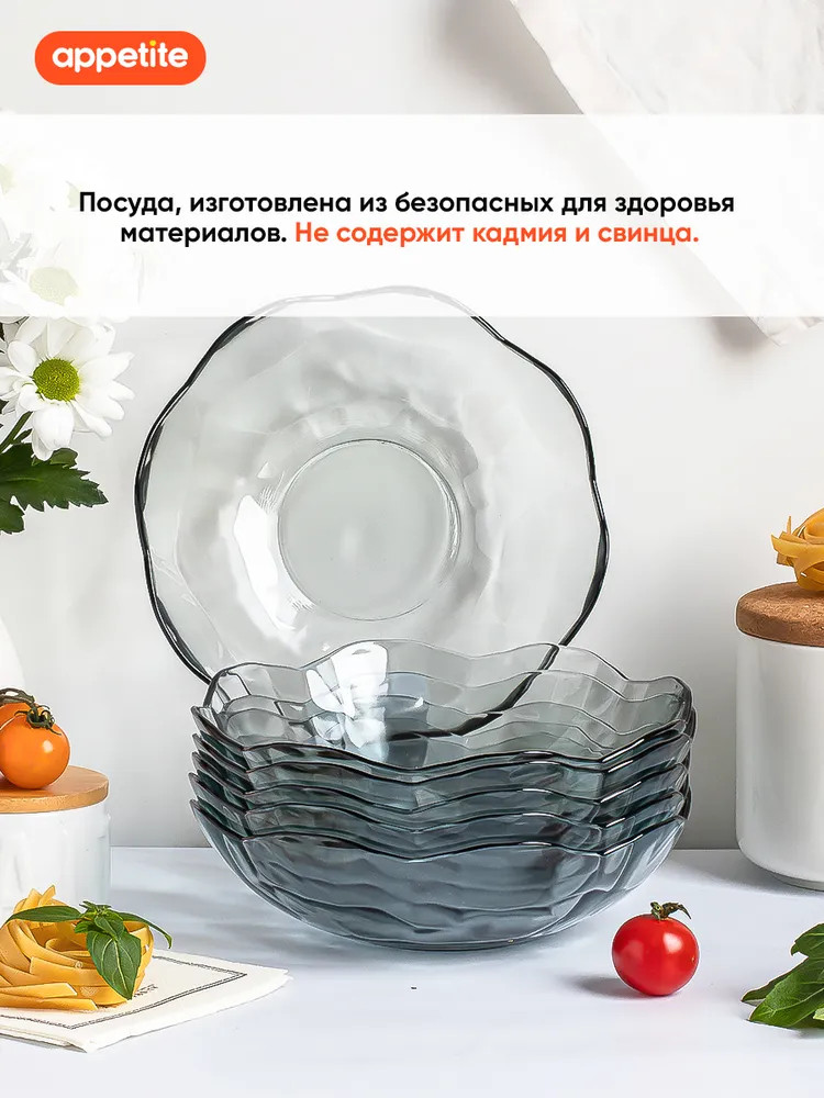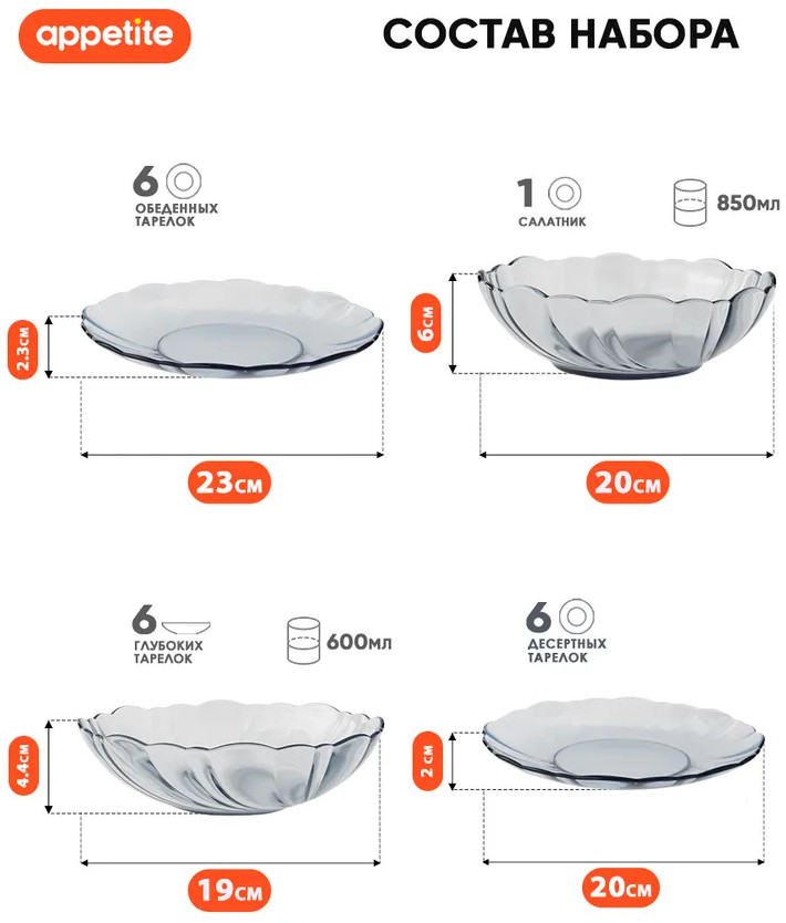 💳 Оплатить за товар можно при получении 🇰🇿 Есть бесплатная доставка по Казахстану от 1 дня 🎁 Копите бонусы с каждой покупки Серия: Cristal Dreams Набор столовой посуды «Cristal Dreams» ТМ Appetite из серого стекла благородного оттенка идеально подходит для ежедневного использования, праздников или особенных случаев. Лаконичная и изящная посуда станет изюминкой на любой кухне и добавит элегантности сервировке блюд. Посуда устойчива к появлению царапин и резким перепадам температур. Набор рассчитан на 6 персон. |