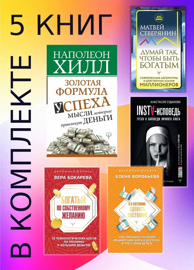Пять разных книг о финансах подготовят вас к путешествию в мир больших денег. От работы с мышлением до приобретения конкретных навыков. Способы заработка и настройка мозга, выбор ниши и трекер необходимых компетенций. Ваш личный бизнес-план готов, а путь к богатству открыт. |