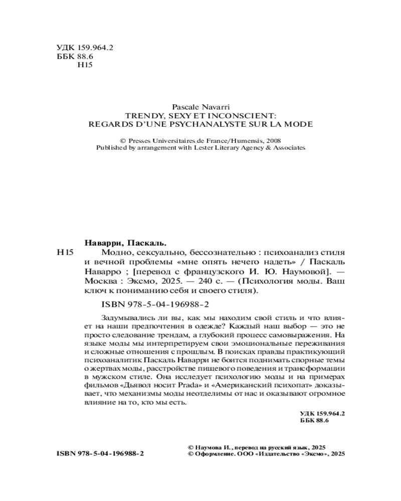 💳 Оплатить за товар можно при получении 🇰🇿 Есть бесплатная доставка по Казахстану от 1 дня 🎁 Копите бонусы с каждой покупки Серия: Модная психология Наше подсознание умеет говорить на языке моды. Выбирая одежду, мы выбираем нового себя. А наш облик — не просто следование трендам, это попытка найти внутреннюю опору. Практикующий психоаналитик Паскаль Наварри объясняет, какие психологические механизмы отвечают за наш внешний вид: что мы хотим показать при помощи одежды, а что стремимся скрыть. С помощью психоанализа автор отвечает на вопросы, о которых принято молчать: андрогинность в модельном бизнесе, вечный инфантилизм, логомания и шопоголизм. Законы фэшн-психологии Наварри объясняет на примере модных икон. Как Карл Лагерфельд защищался очками от своей матери? Почему сказки Коко Шанель об отце сделали ее модельером? Что говорит образ Дэвида Бекхэма о женской стороне его личности? |
