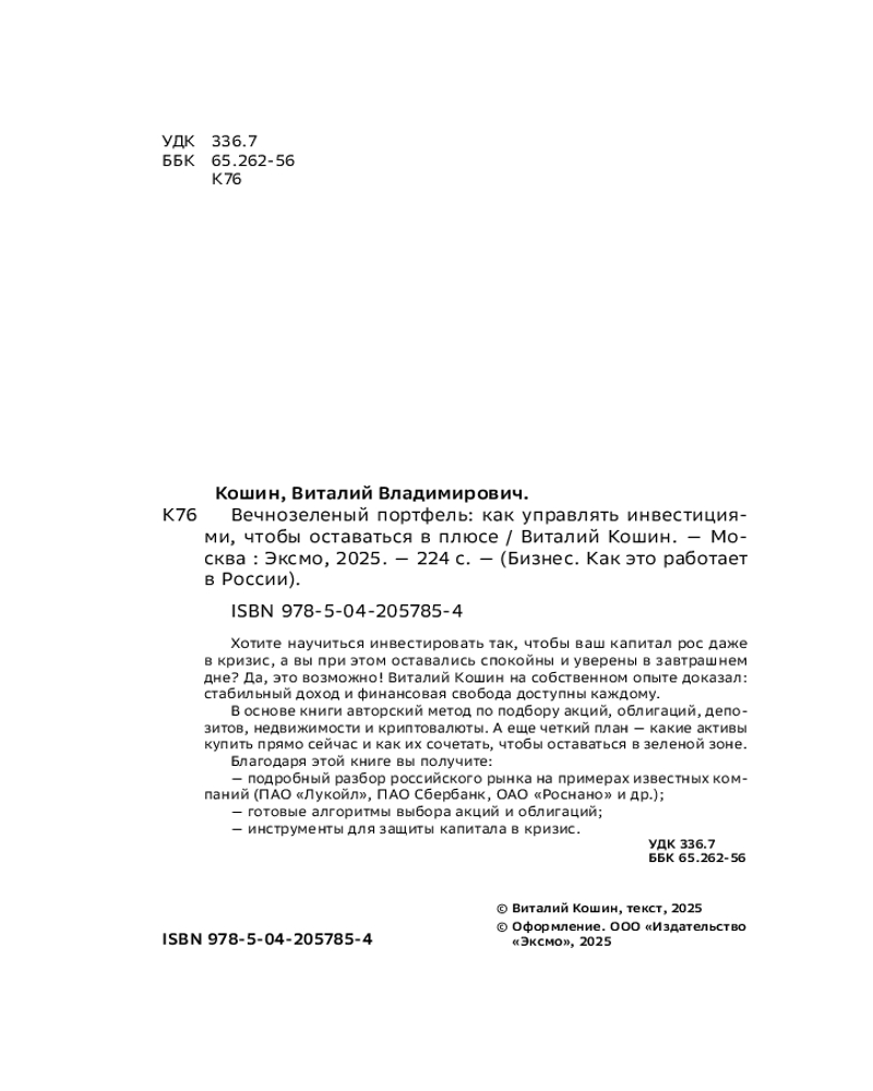 💳 Оплатить за товар можно при получении 🇰🇿 Есть бесплатная доставка по Казахстану от 1 дня 🎁 Копите бонусы с каждой покупки Серия: Бизнес. Как это работает в России Хотите научиться инвестировать так, чтобы ваш капитал рос даже в кризис, а вы при этом оставались спокойны и уверены в завтрашнем дне? Да, это возможно! Виталий Кошин на собственном опыте доказал: стабильный доход и финансовая свобода доступны каждому. В основе книги авторский метод по подбору акций, облигаций, депозитов, недвижимости и криптовалюты. А еще четкий план — какие активы купить прямо сейчас и как их сочетать, чтобы оставаться в зеленой зоне. |