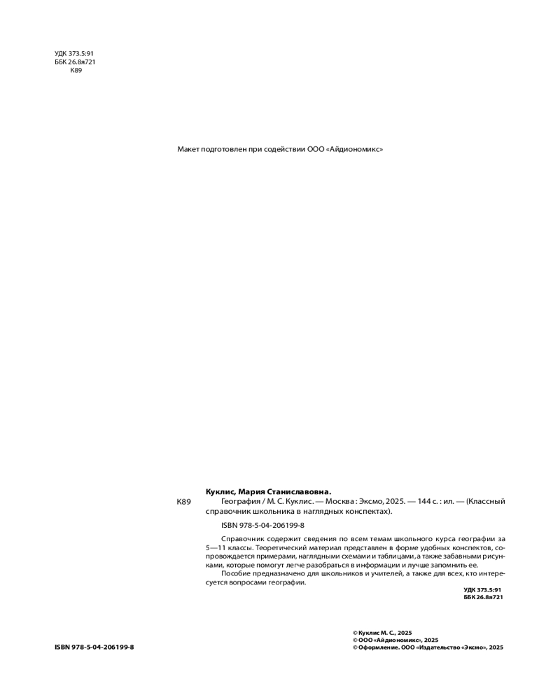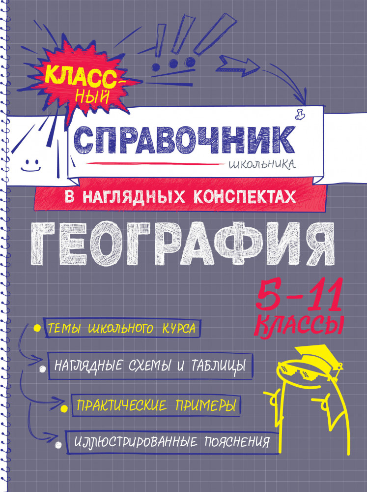💳 Оплатить за товар можно при получении 🇰🇿 Есть бесплатная доставка по Казахстану от 1 дня 🎁 Копите бонусы с каждой покупки Серия: Классный справочник школьника в наглядных конспектах Справочник по географии в наглядных конспектах для учеников 5, 6, 7, 8, 9, 10 и 11 классов превращает изучение каждой темы в увлекательное и познавательное приключение! Книга поможет запоминать и повторять материал на протяжении всего школьного курса. Благодаря наглядной подаче теории с примерами, схемами, а также забавными рисунками, текст становится доступным и интересным. Визуальный подход обеспечивает легкость восприятия и запоминания информации, ведь она оформлена в виде конспектов, словно ученик писал их сам. Всевозможные иллюстрации и места для собственных примеров и примечаний помогут сделать процесс обучения максимально простым и приятным! А при желании можно взять маркеры и сделать свой конспект еще более уникальным и персонализированным! |