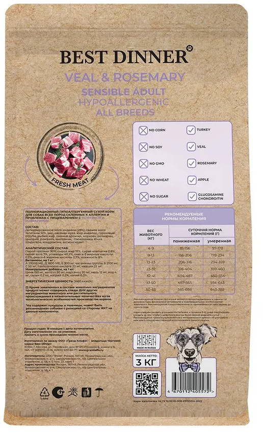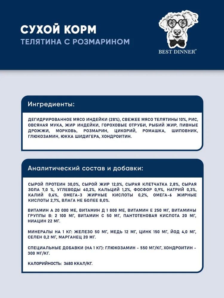 Best Dinner Корм для собак крупных и средних пород с телятиной и розмарином «Sensible»