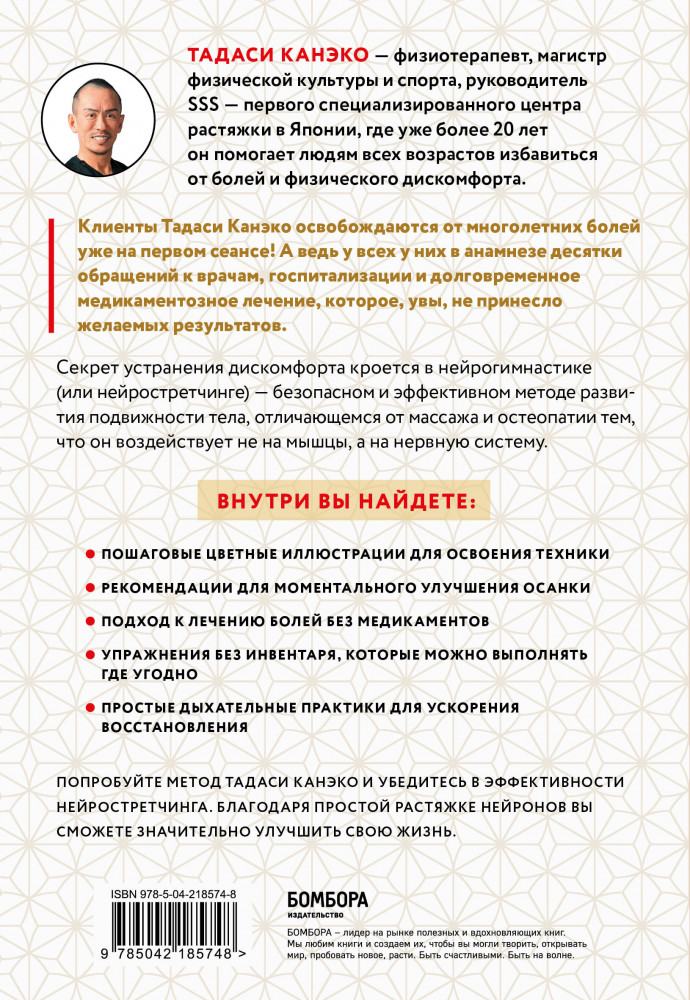 💳 Оплатить за товар можно при получении 🇰🇿 Есть бесплатная доставка по Казахстану от 1 дня 🎁 Копите бонусы с каждой покупки Серия: Целительные практики Азии и древнего Востока Перестаньте мириться с болью — начните новую жизнь уже сегодня с уникальной методикой, подарившей свободу движения тысячам людей! Японский эксперт Тадаси Канэко раскрывает инновационную технику «растяжки нейронов», которая помогла тысячам пациентов избавиться от мучительных болей без таблеток и операций. В отличие от обычного массажа и растяжки, данный подход воздействует непосредственно на нервную систему — истинную причину многих хронических болей. Простые упражнения с пошаговыми иллюстрациями помогут устранить дискомфорт в шее, спине, суставах и других проблемных зонах всего за несколько минут в день. Уже после первых занятий вы почувствуете, как тело обретает легкость, а боль отступает. Включенные в книгу реальные истории исцеления доказывают: метод работает даже в сложных случаях болевого синдрома. Благодаря простым и безопасным техникам, которые можно выполнять где угодно и без специального оборудования, эта книга станет незаменимым помощником для тех, кто хочет вернуть телу легкость движений и избавиться от многолетних болей. |