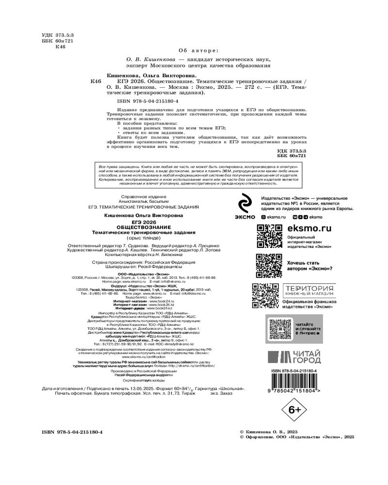 💳 Оплатить за товар можно при получении 🇰🇿 Есть бесплатная доставка по Казахстану от 1 дня 🎁 Копите бонусы с каждой покупки Серия: ЕГЭ. Тематические тренировочные задания (обложка) Пособие адресовано учащимся старших классов, планирующим сдавать ЕГЭ по обществознанию. Тренировочные задания позволят систематически, при прохождении каждой темы, готовиться к экзамену. В сборнике представлены задания разных типов по всем темам ЕГЭ с ответами и критериями оценивания. Задания максимально приближены к реальным, используемым на экзамене, но распределены по темам в порядке их изучения в 10-11 классах старшей школы. |